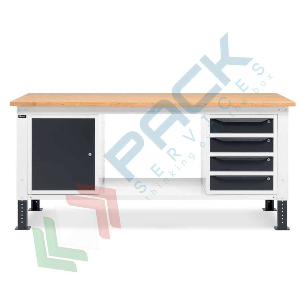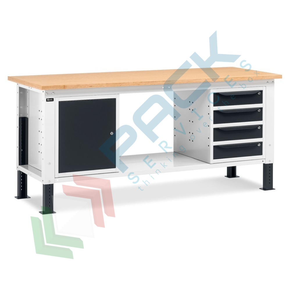 Banco da lavoro piano in legno con gambe regolabili, 4 cassetti + 1 con porta, Mis. 2000 L x 750 P x 740/1100 H mm, colore antracite/grigio chiaro