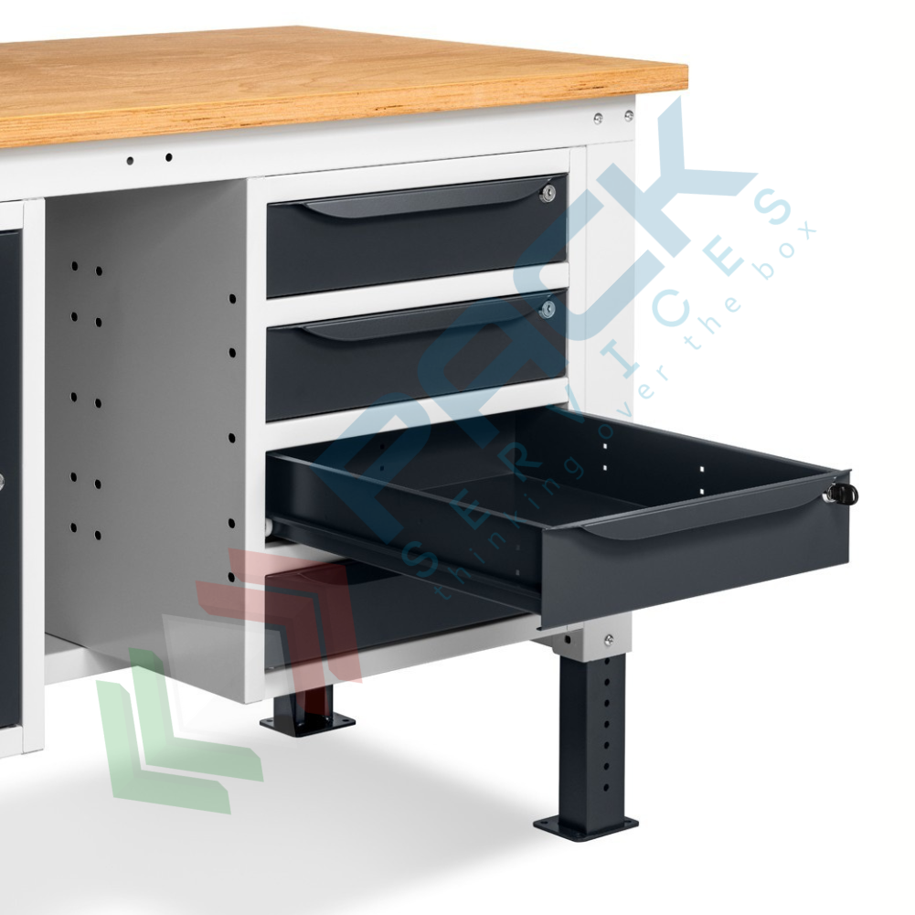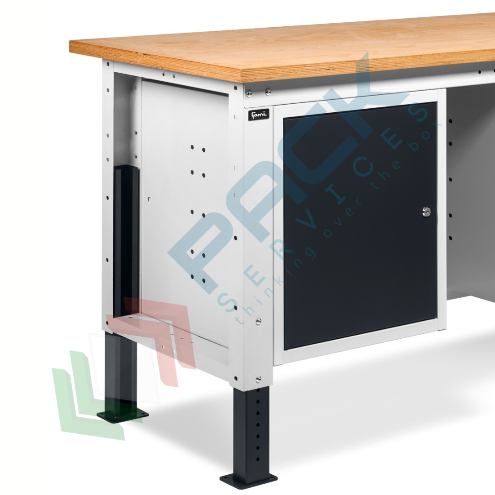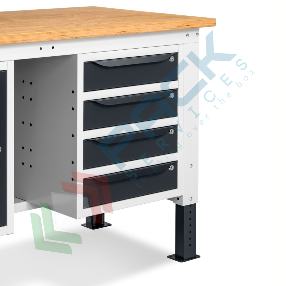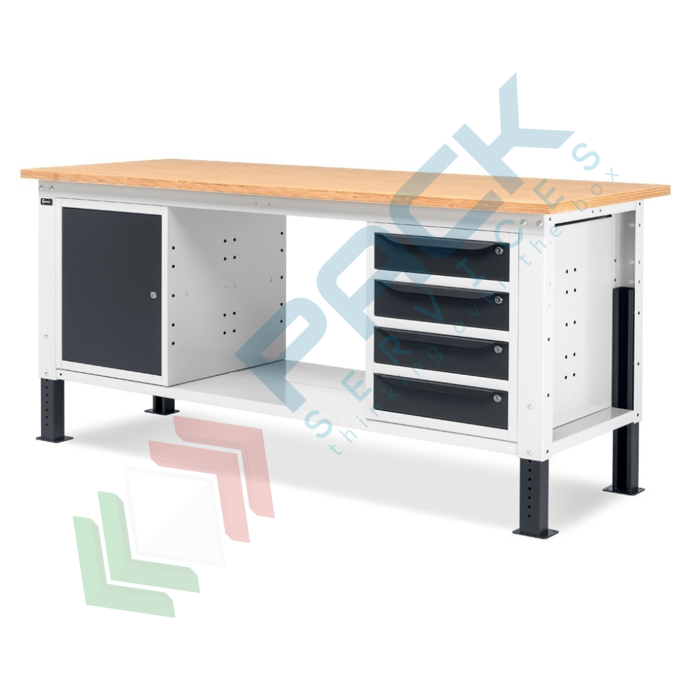 Banco da lavoro in acciaio, realizzato con piano in multiplex 30 mm, Mis. 2000 L x 750 P x 740/1110 H mm, con gambe regolabili in altezza. Carico massimo del prodotto 1000 Kg. Fornito smontato. L'altezza del banco da lavoro con piano in multiplex può essere facilmente variata meccanicamente per regolare il piano di lavoro non solo in base alle lavorazioni da effettuare, ma anche secondo l'altezza dell'operatore. Il banco con piano in legno è una soluzione ideale per effettuare operazioni pesanti. Nella parte inferiore del banco sono installati un armadio a cassetti con 4 cassetti, un armadio con porta e un piano per disporre di spazi di dimensioni diverse per lo stoccaggio del materiale. Colore lamiera in acciaio grigio antracite RAL 7016 + grigio chiaro RAL 7035.