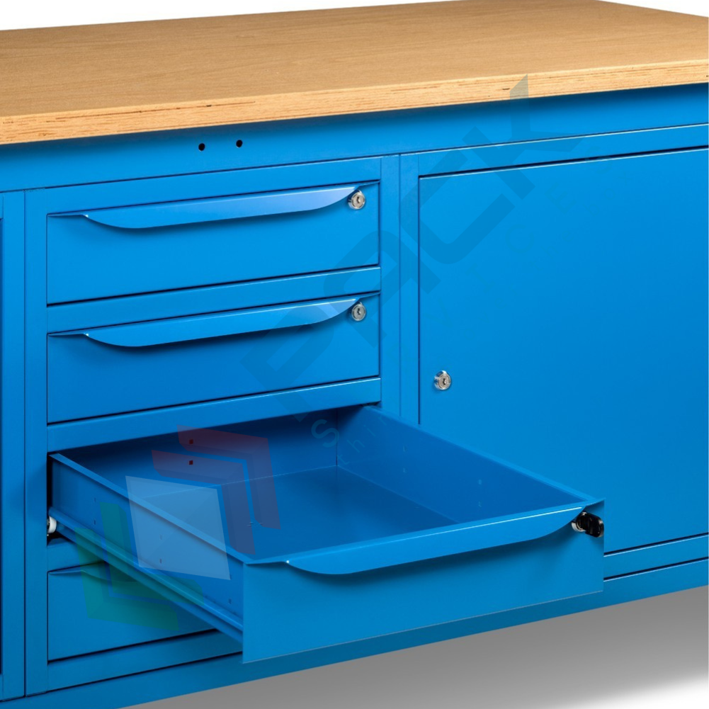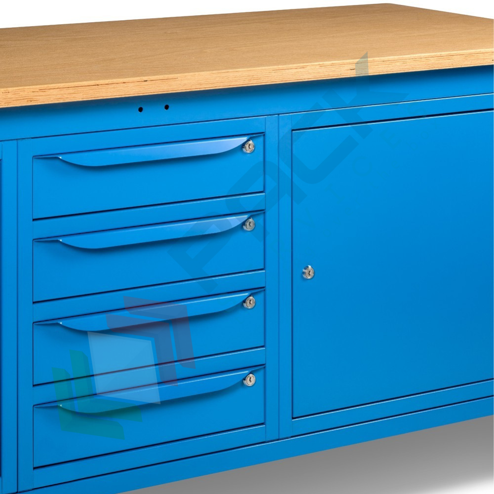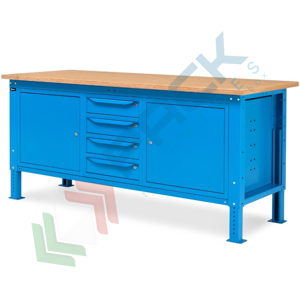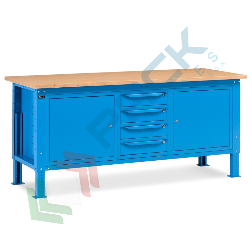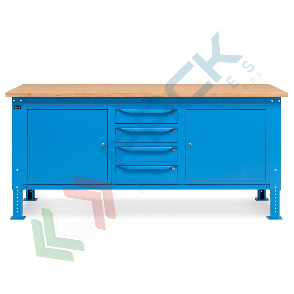 Banco da lavoro in acciaio, realizzato con piano in multiplex 30 mm, Mis. 2000 L x 750 P x 740/1110 H mm, con gambe regolabili in altezza. Carico massimo del prodotto 1000 Kg. Fornito smontato. L'altezza del banco da lavoro con piano in multiplex può essere facilmente variata meccanicamente per regolare il piano di lavoro non solo in base alle lavorazioni da effettuare, ma anche secondo l'altezza dell'operatore. Il banco con piano in legno è una soluzione ideale per effettuare operazioni pesanti. Nella parte inferiore del banco sono installati un armadio a cassetti con 4 cassetti e due armadi con porta per disporre di spazi di dimensioni diverse per lo stoccaggio del materiale. Colore lamiera in acciaio blu RAL 5012.
