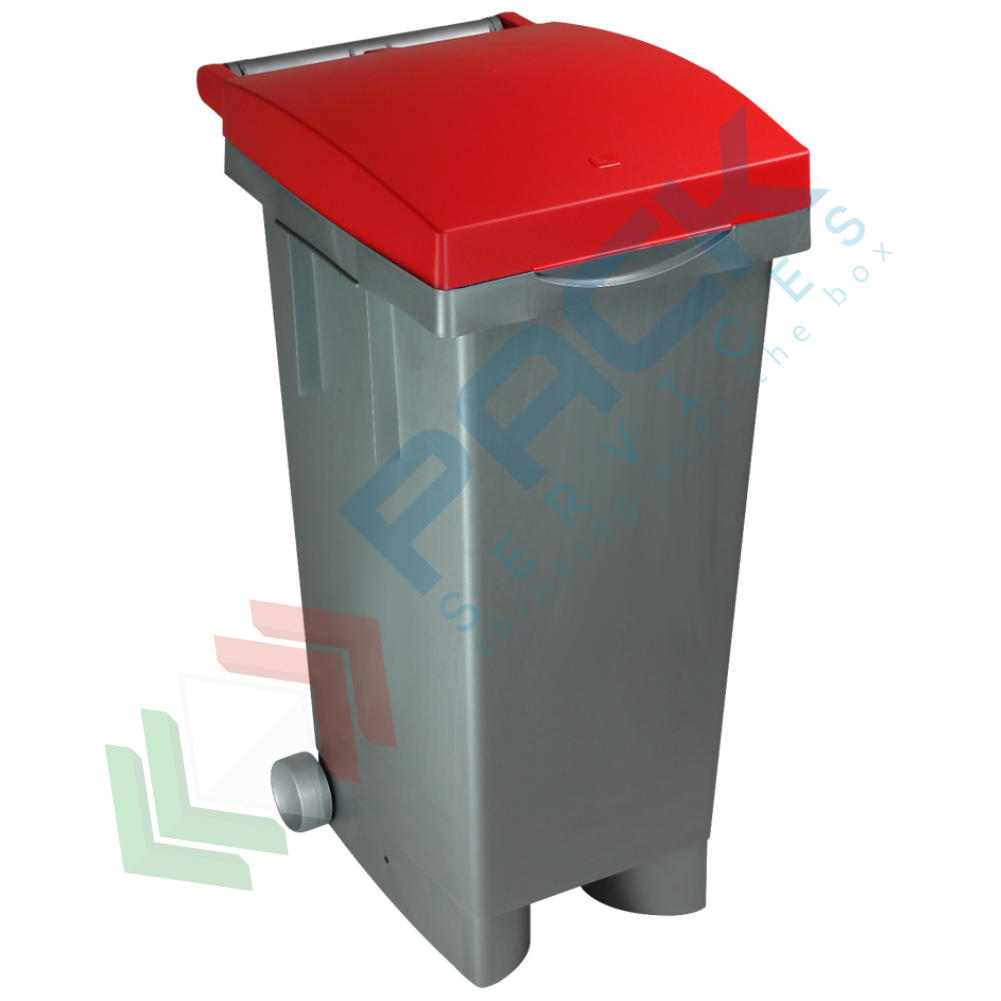 Contenitore per la raccolta differenziata dei rifiuti, Mis. 380 L x 500 P x 800 H mm, capacità 80 Lt. Bidone realizzato in plastica PP (polipropilene), assemblato con anello fermasacco sorregge un sacco di polietilene , definito "tipo condominiale", per la raccolta dei rifiuti domestici o assimilabili dalle dimensioni 70x110. Il coperchio chiude il contenitore impedendo l’accesso al sacchetto ad insetti ed altro. Cassonetto raccolta differenziata dotato di due coppie di ruote in plastica gemellate, particolarmente adatto per ambienti interni. Pedale non presente. Colore corpo grigio, coperchio rosso.