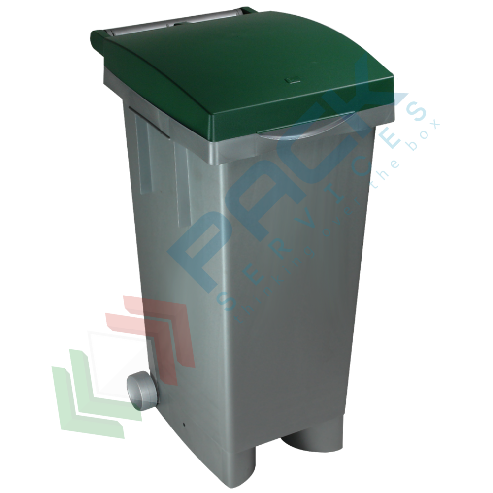 Contenitore per la raccolta differenziata dei rifiuti, Mis. 380 L x 500 P x 800 H mm, capacità 80 Lt. Bidone realizzato in plastica PP (polipropilene), assemblato con anello fermasacco sorregge un sacco di polietilene , definito "tipo condominiale", per la raccolta dei rifiuti domestici o assimilabili dalle dimensioni 70x110. Il coperchio chiude il contenitore impedendo l’accesso al sacchetto ad insetti ed altro. Cassonetto raccolta differenziata dotato di due coppie di ruote in plastica gemellate, particolarmente adatto per ambienti interni. Pedale non presente. Colore corpo grigio, coperchio verde.