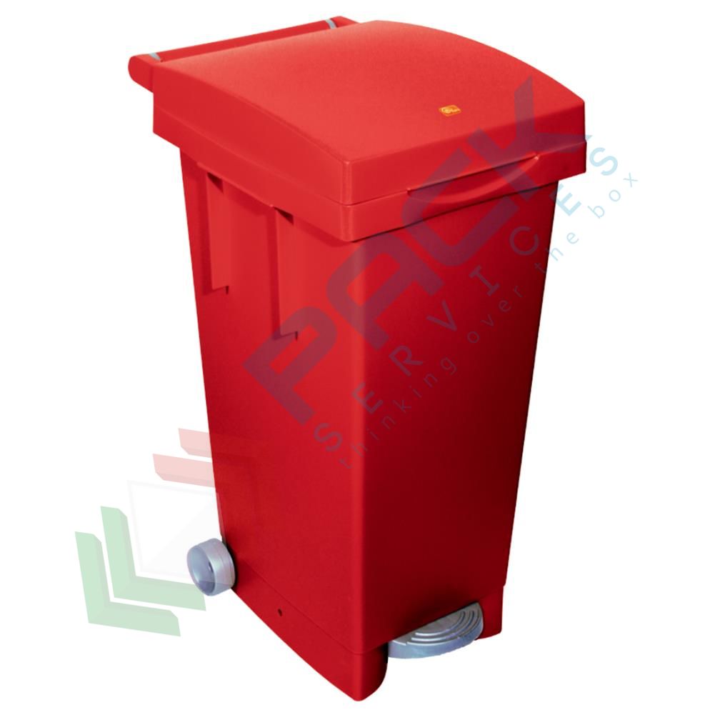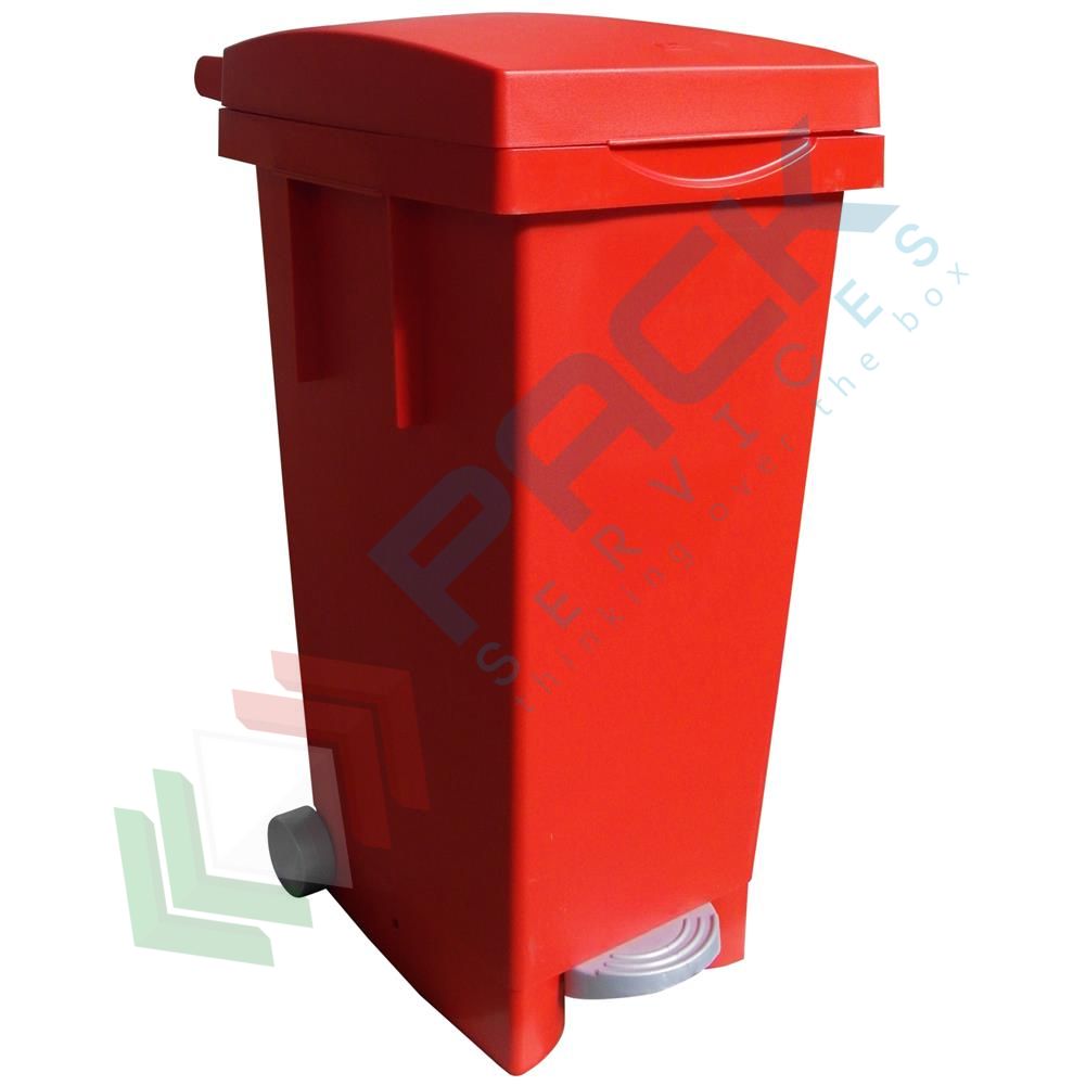 Bidone spazzatura per la raccolta differenziata rifiuti, capacità 80 Lt, con ruote, pedale e anello fermasacco, chiusura con coperchio a cerniera, colore rosso