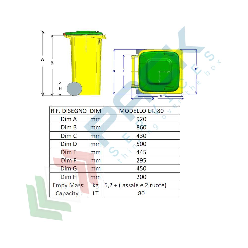 • Note: coperchio incernierato, dotato di assale in metallo per due ruote da mm 200 in gomma con innesto a naso, bordo rinforzato a pettine atto al sollevamento per lo svuotamento automatico
