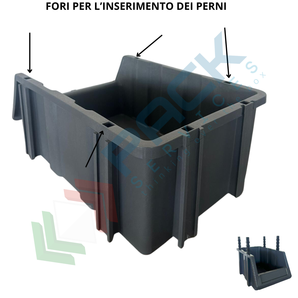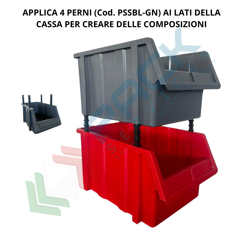 Cassetta bocca di lupo componibile e sovrapponibile realizzata in plastica (PP) polipropilene, capacità 7 Litri, Mis. esterna 173 L x 402 P x 150 H mm, Mis. interna 138 L x 345 P x 148 H mm. Il contenitore a bocca di lupo è la soluzione ideale ad ogni problema di stoccaggio: indicato per minuteria, articoli di ferramenta e piccoli oggetti sfusi. La cassetta in plastica bocca di lupo consente di avere sempre a portata di mano e ben in vista il contenuto, rendendolo prelevabile con estrema facilità. Il contenitore in plastica è componibile attraverso un perno (Cod. PSSBL-GN) applicabile sui 4 lati superiori o inferiori della cassetta; I perni permettono infatti di creare una vera a propria parete in magazzino senza alcuna necessità di ripiani o scaffali. Grande profondità per una sistemazione ottimale nelle scaffalature. Movimentazione agevolata grazie alle maniglie che garantiscono una impugnatura sicura, anche con mani guantate.
