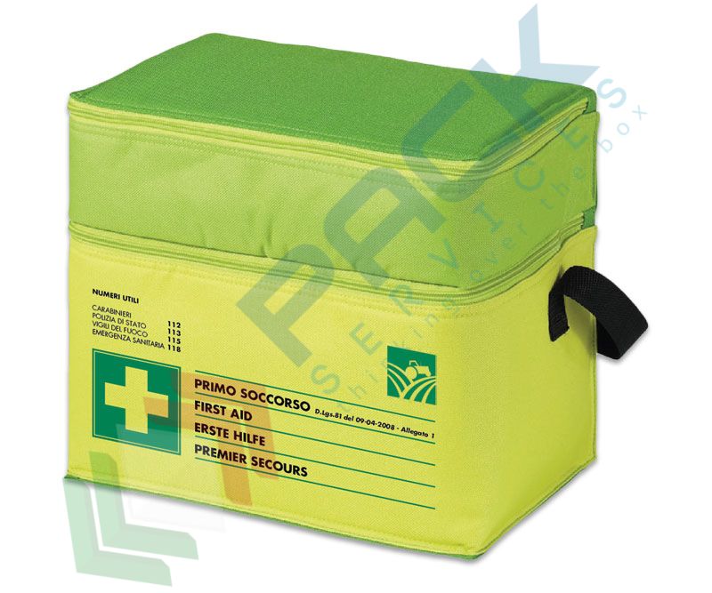 Borsetta pronto soccorso in Nylon resistente colore FLUO con scomparti interni e tracolla, completa del contenuto previsto dall'allegato 1 del D.M. 388 del 15 luglio 2003 e D.L. 81 del 09 aprile 2008 art. 45, obbligatorio quindi per aziende o unità produttive del gruppo A e B con più di 3 lavoratori. Misura 30 x 20 x 25 cm. Il contenuto della borsa primo soccorso prevede un contenuto base, ovvero tutti i prodotti necessari in caso di emergenza come cerotti, guanti, garze, termometro, forbici e molto altro + MAGGIORAZIONE comparto AGRICOLTURA. Borsa primo soccorso idonea per il trasporto all’aperto grazie al rivestimento termico.