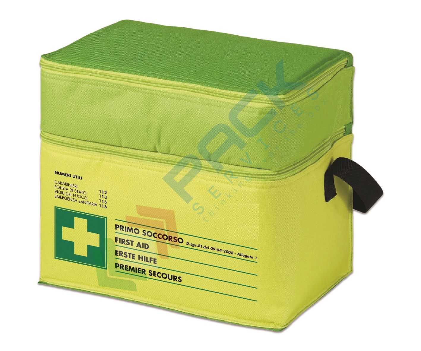 Borsetta pronto soccorso in Nylon resistente colore FLUO con scomparti interni e tracolla, completa del contenuto previsto dall'allegato 1 del D.M. 388 del 15 luglio 2003 e D.L. 81 del 09 aprile 2008 art. 45, obbligatorio quindi per aziende o unità produttive del gruppo A e B con più di 3 lavoratori. Misura 30 x 20 x 25 cm. Il contenuto della borsa primo soccorso prevede un contenuto base, ovvero tutti i prodotti necessari in caso di emergenza come cerotti, guanti, garze, termometro, forbici e molto altro.