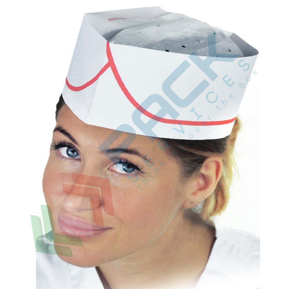 Cappellini monouso, realizzati in carta bianca sbiancata, 80 gr/m2, Mis. 28 L x 8,2 H cm. Cappellini monouso realizzati in cellulosa, soffici e confortevoli che coprono la capigliatura assicurando massimo igiene e protezione, modello conformabile con calotta traforata. Prodotto unisex, ideale sia per uomo che per donna. Cuffia monouso ideale per il settore alberghiero, della ristorazione e catering. Dispositivo di protezione individuale (D.P.I.) di I categoria, ideale solo per rischi minimi, con marcatura CE. Confezione composta da 100 pezzi. Colore bianco/rosso. Taglia unica.