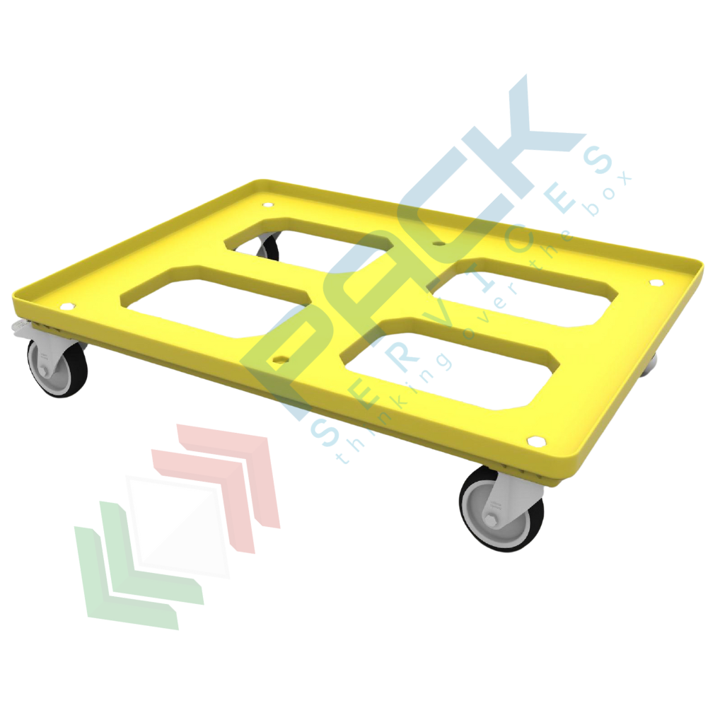 Pianale su rotelle per contenitori a norma europea con struttura del telaio in ABS migliorata per evitare possibili crepe e piegature in carichi completi. Grazie alle 4 ruote in gomma girevoli il carrello è scorrevole e molto maneggevole anche in spazi stretti. Supporti in metallo girevoli su tutte e quattro le ruote. Colore giallo.