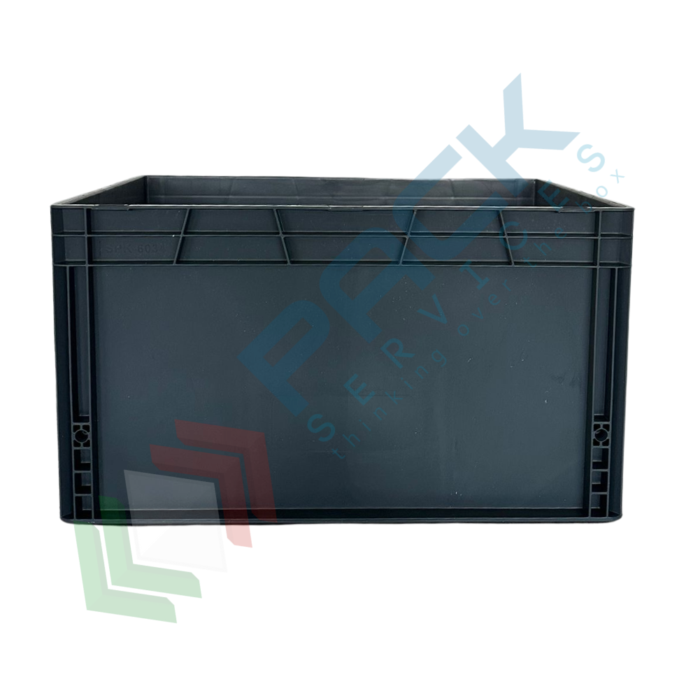 Contenitore plastica sovrapponibile Norma Europa, capacità 65 Litri, Mis. esterna 600 L x 400 P x 320 H mm, Mis. interna 570 L x 370 P x 315 H mm. La cassetta in plastica è realizzata in polipropilene riciclato (PP-PCR), presenta base e pareti chiuse e maniglie passanti. Cassa in plastica NON idonea al contatto alimentare, portata 30 Kg.