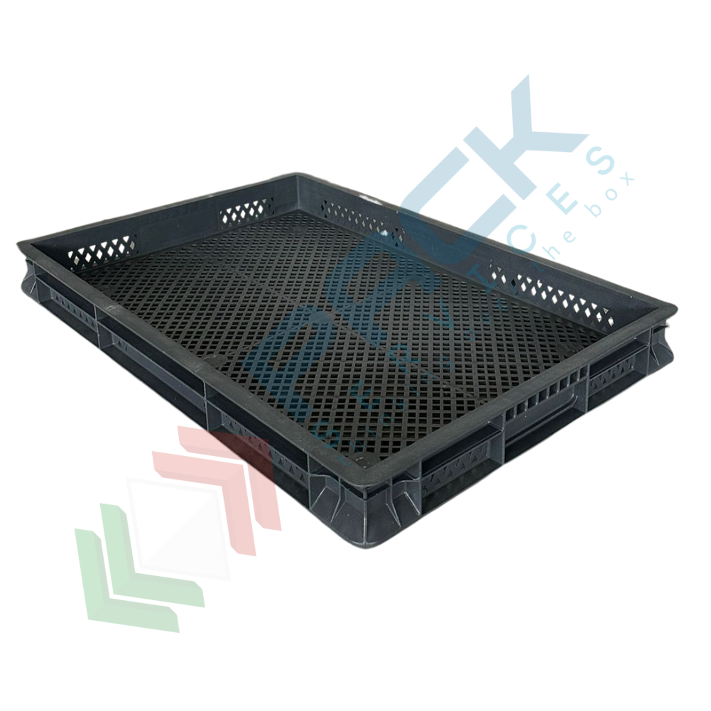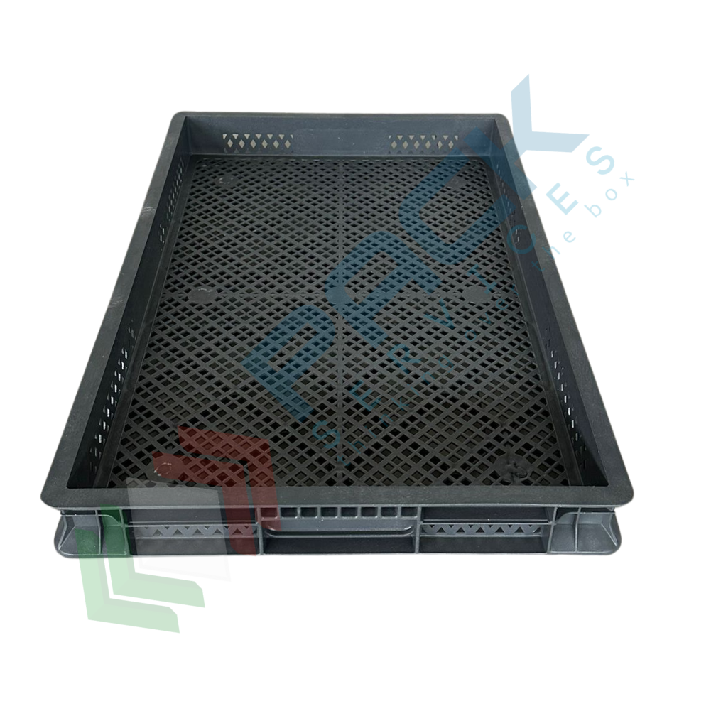 Contenitore in plastica sovrapponibile Norma Europa, capacità 9 Lt, con misura esterna: 600 L x 400 P x 50 H mm e misura interna: 569 L x 366 P x 40 H mm. La cassetta presenta base, pareti forate e maniglie chiuse. Contenitore realizzato in polipropilene riciclato (PP-PCR). Colore grigio. Scatola in plastica NON idonea al contatto con alimenti.