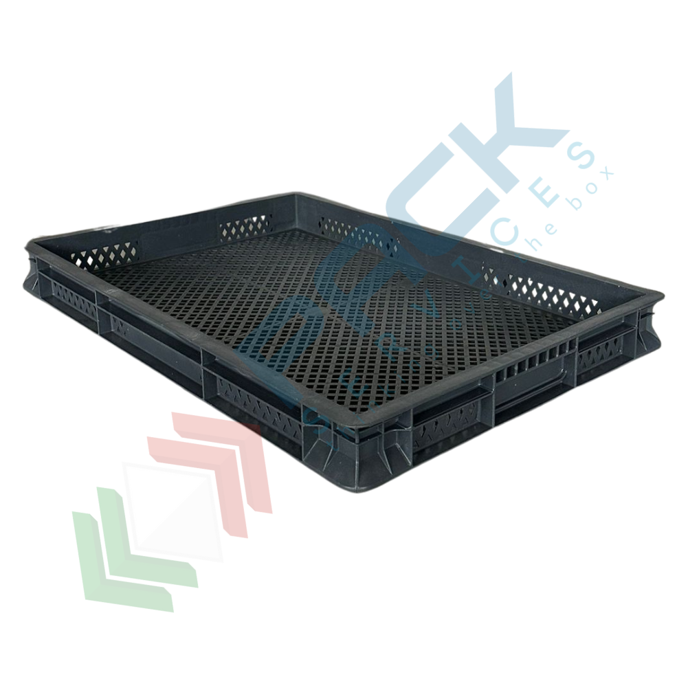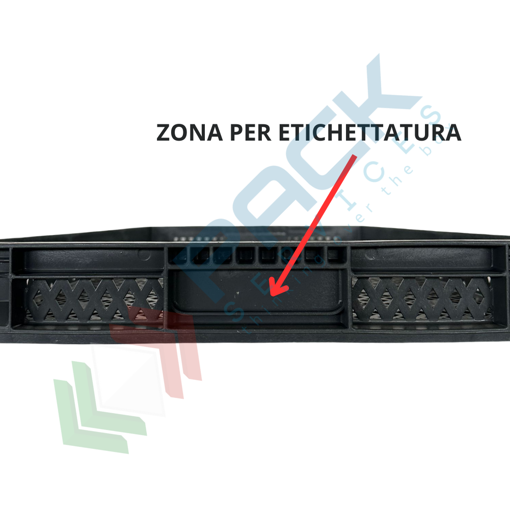 Cassetta in plastica riciclata (PP) sovrapponibile, 9 Lt, mis. 600 L x 400 P x 50 H mm, base e pareti forate, maniglie chiuse