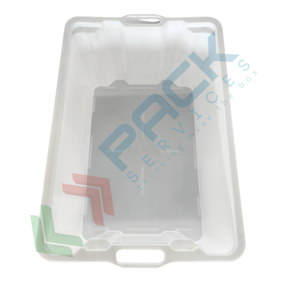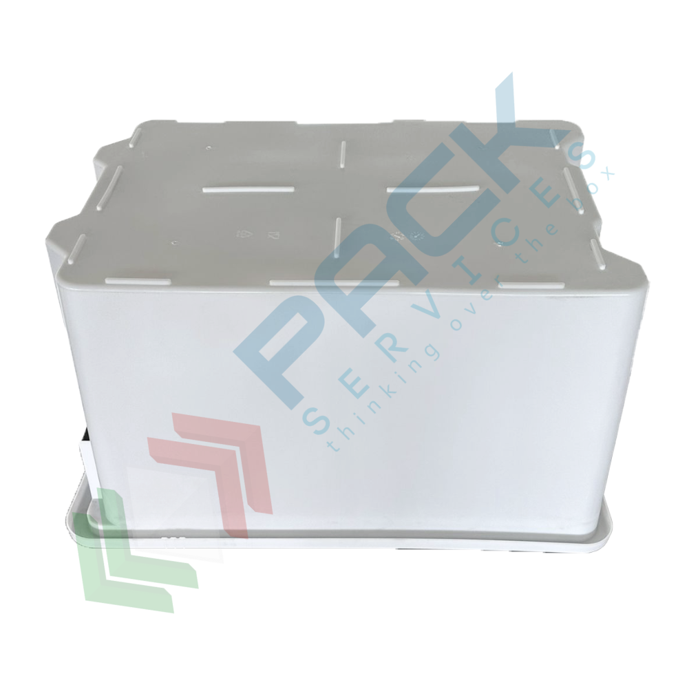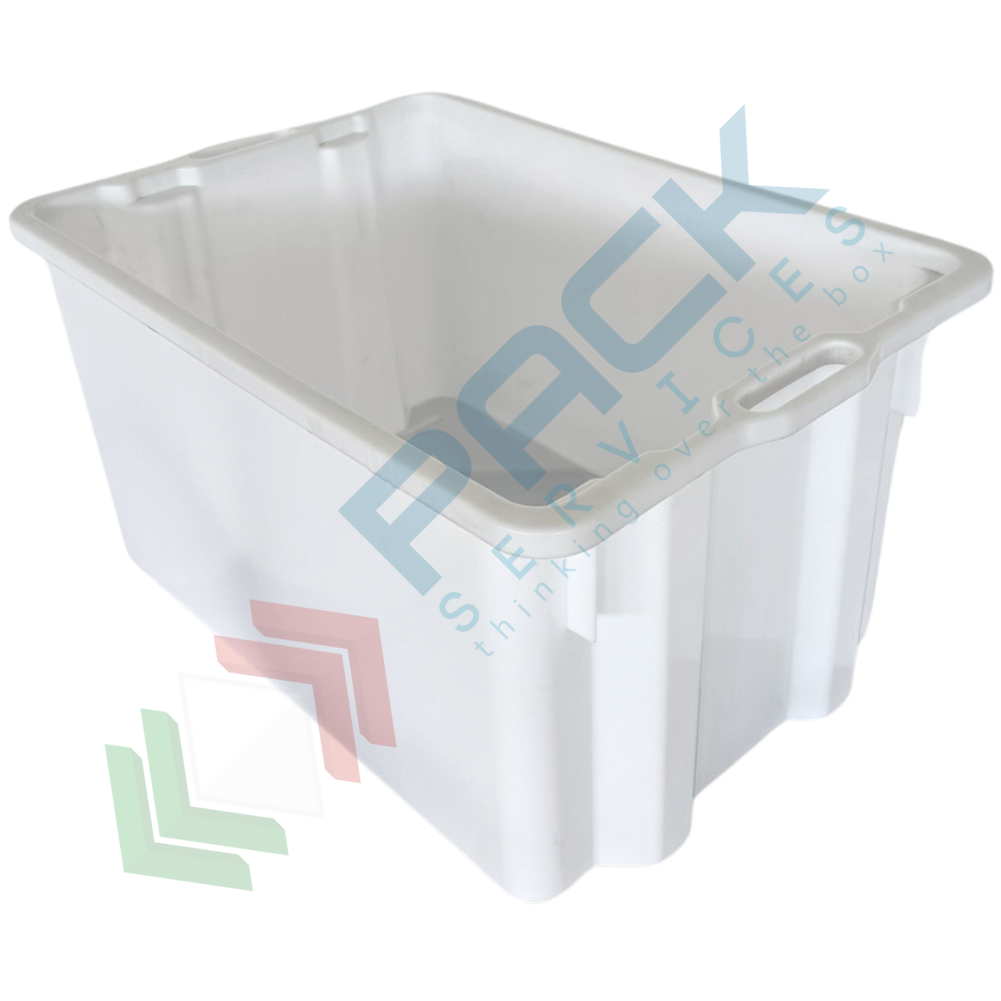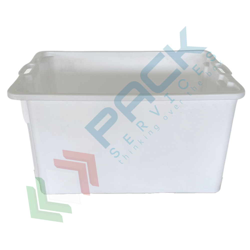 Cassetta in plastica (HDPE) sovrapponibile ed inseribile, capacità 90 Lt, Mis. 750 L x 460 P x 360 H mm, base chiusa e pareti chiuse, colore bianco