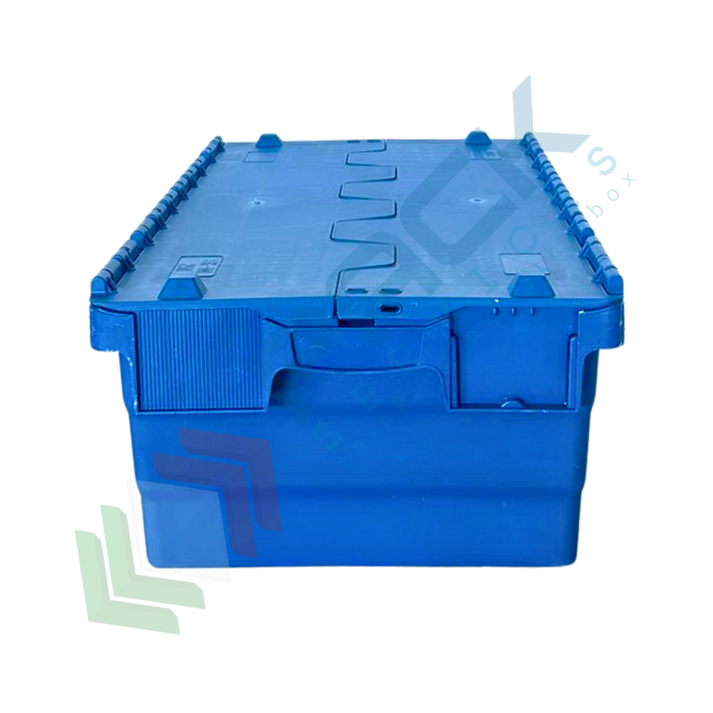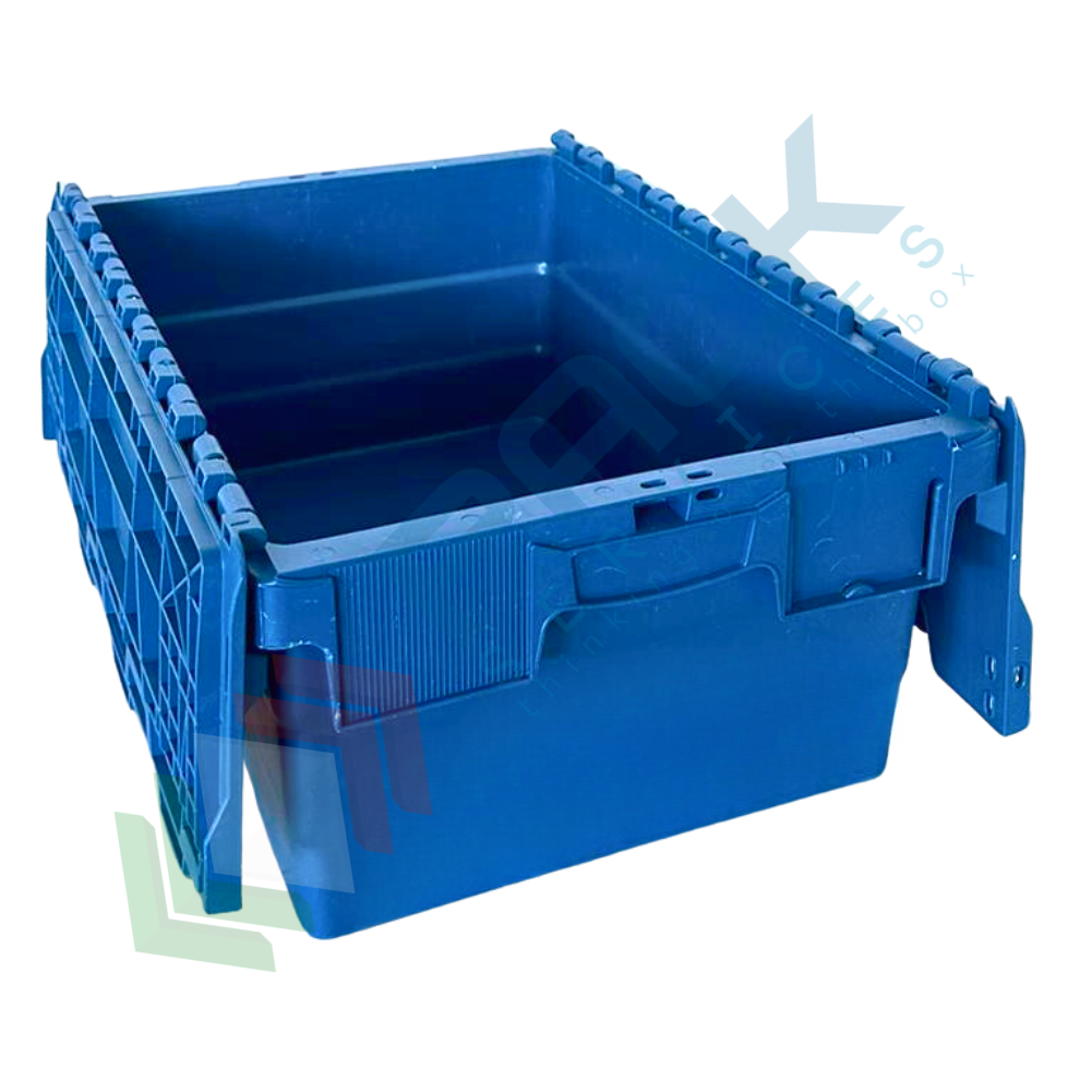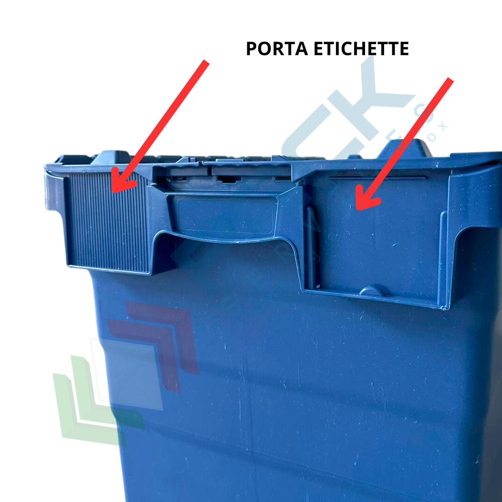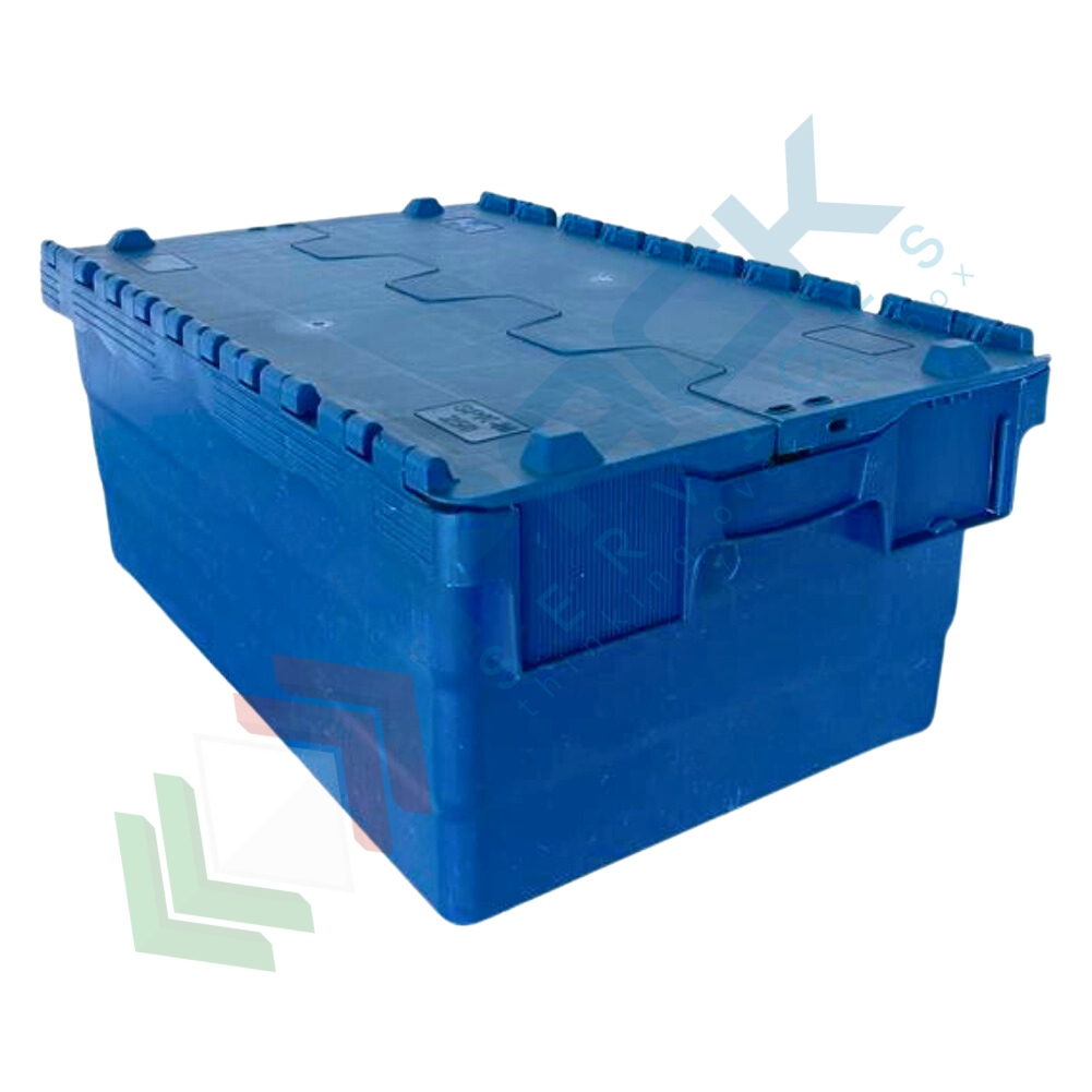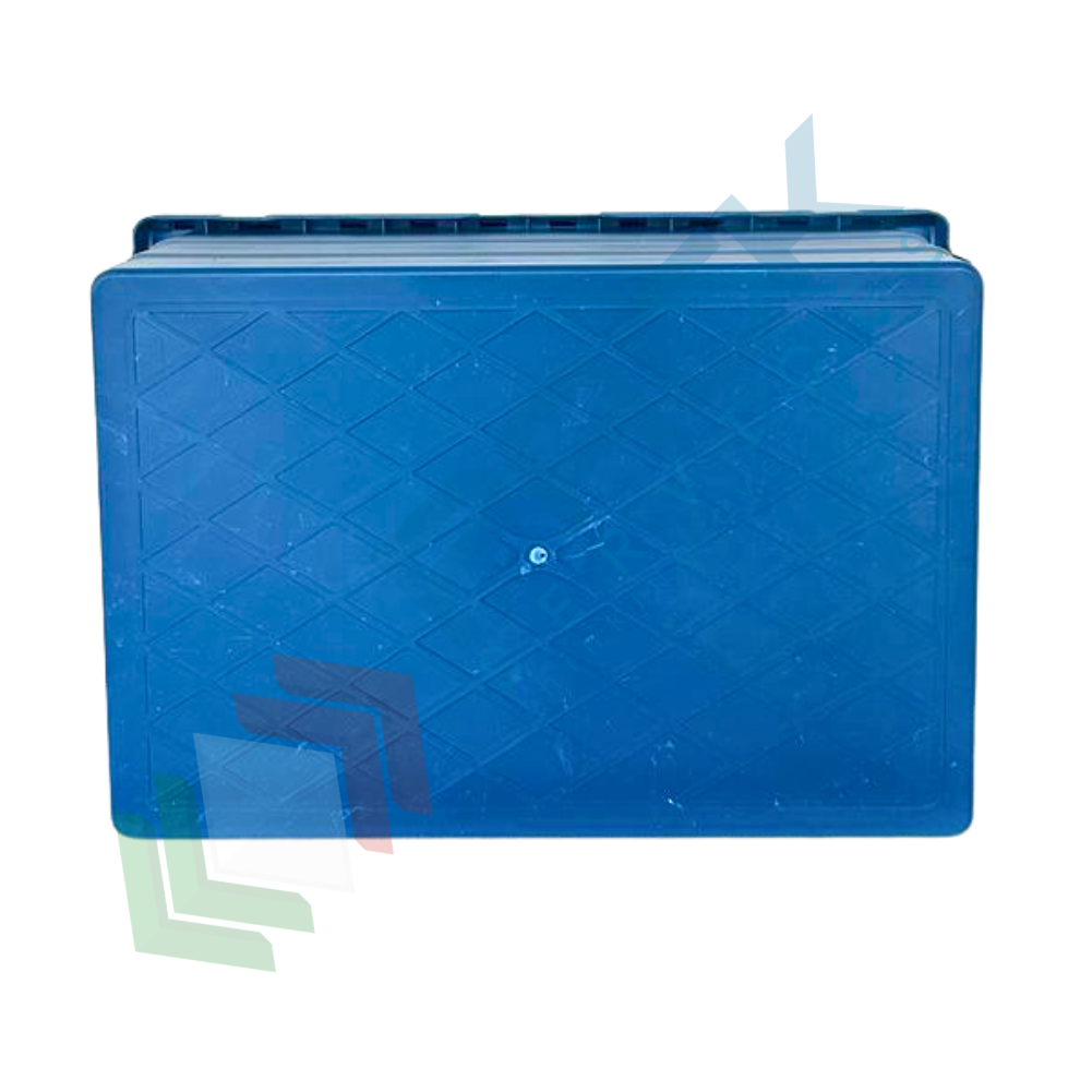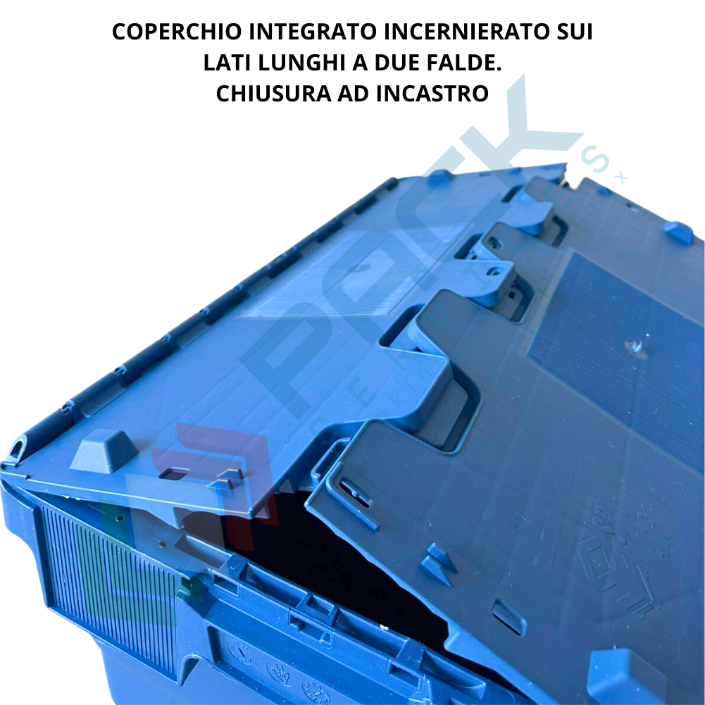 Cassa sovrapponibile ed inseribile in plastica, con coperchio integrato incernierato sui lati lunghi a due falde sigillabile, volume 45 Lt, Mis. esterna superiore 600 L x 400 P x 250 H mm, Mis. interna superiore 540 L x 367 P x 232 H mm. Grazie alla sua forma leggermente conica, da vuota è possibile impilarne una dentro l'altra con poco ingombro o altrimenti una sopra l'altro con il coperchio chiuso formando così delle pile stabili.