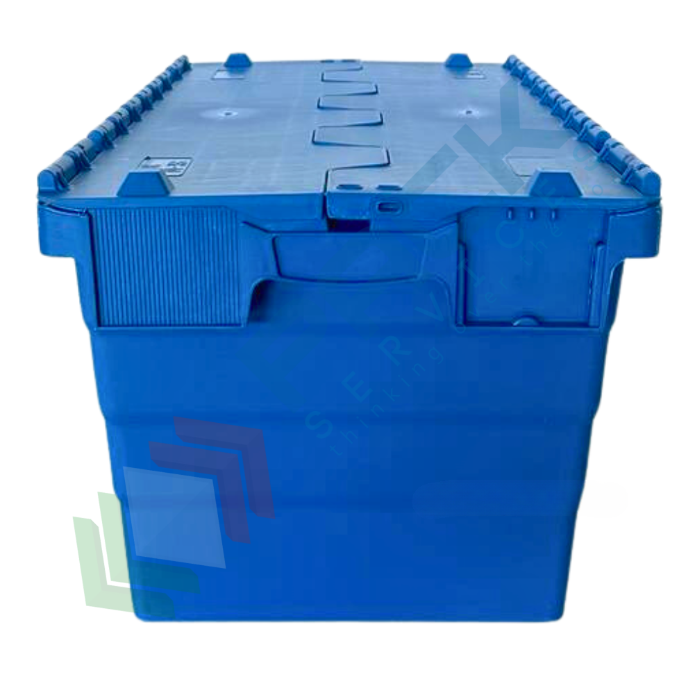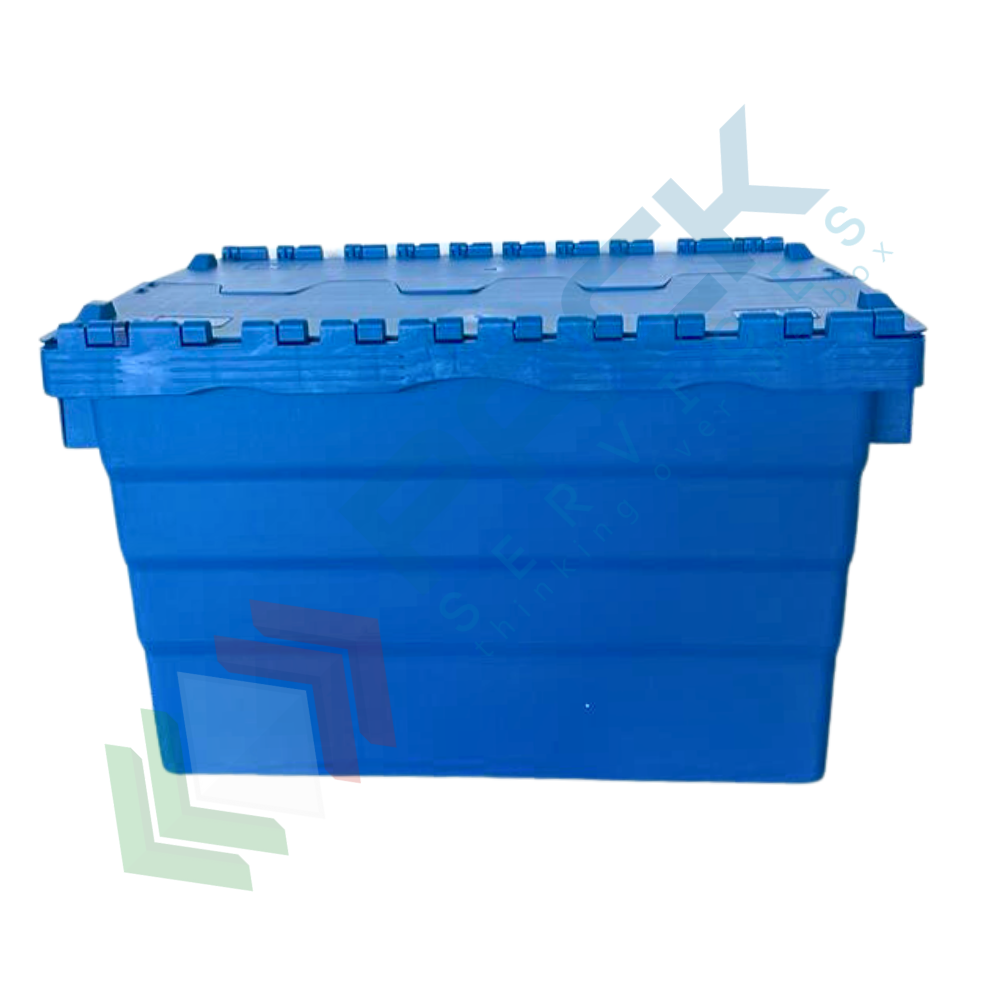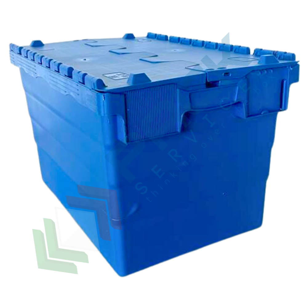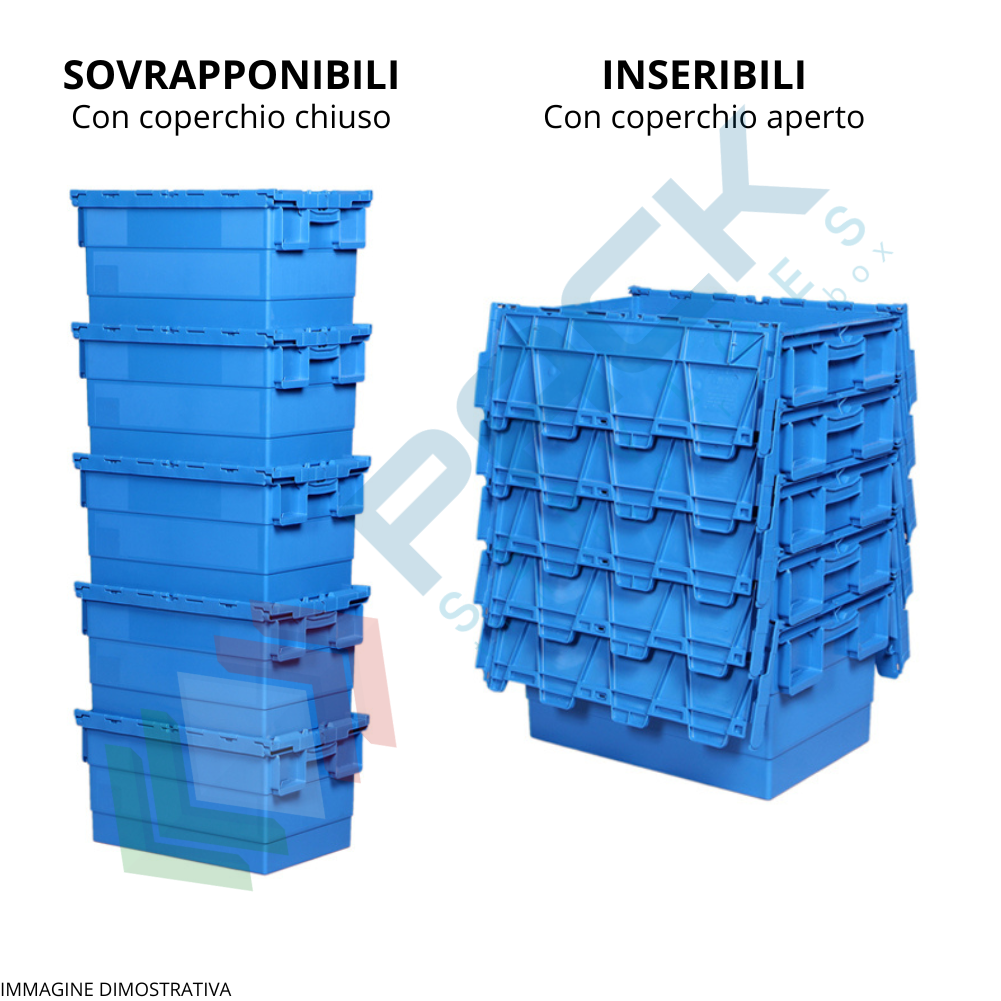 Cassa sovrapponibile ed inseribile in plastica, con coperchio integrato incernierato sui lati lunghi a due falde sigillabile, volume 68 Lt, Mis. esterna superiore 600 L x 400 P x 365 H mm, Mis. interna superiore 540 L x 367 P x 347 H mm. Grazie alla sua forma leggermente conica, da vuota è possibile impilarne una dentro l'altra con poco ingombro o altrimenti una sopra l'altro con il coperchio chiuso formando così delle pile stabili.