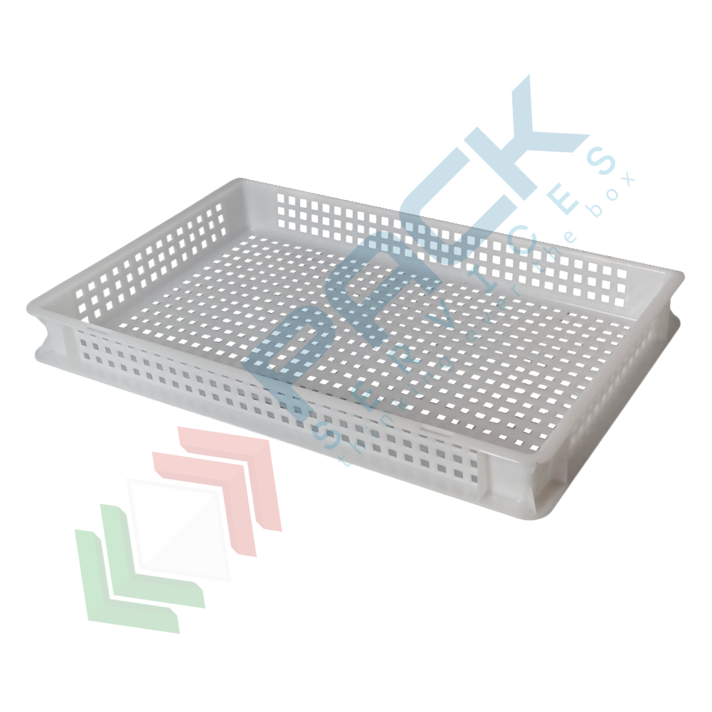 Contenitore sovrapponibile in plastica, capacità 13 Lt, Mis. esterna 600 L x 400 P x 70 H mm, Mis. interna 565 L x 365 P x 67 H mm, con fondo e pareti forate. Cassetta in plastica realizzata in polietilene alta densità (HDPE), ideale per il trasporto e contenimento di alimenti. Scatola in plastica impilabile con maniglie chiuse che trova largo uso nelle aziende alimentari, panetterie, pasticcerie ecc... Colore bianco.