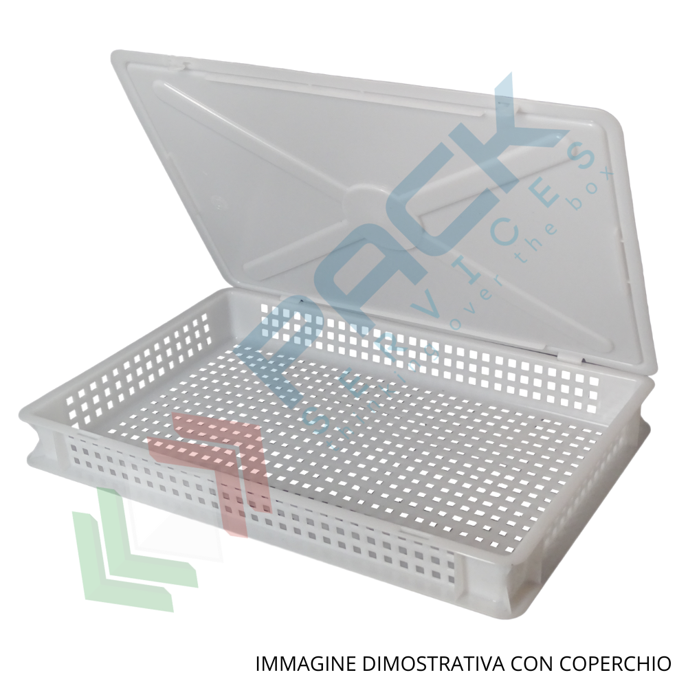 Cassetta in plastica (HDPE) sovrapponibile, capacità 13 Lt, Mis. 600 L x 400 P x 70 H mm, ideale per alimenti, fondo e pareti forate, colore bianco