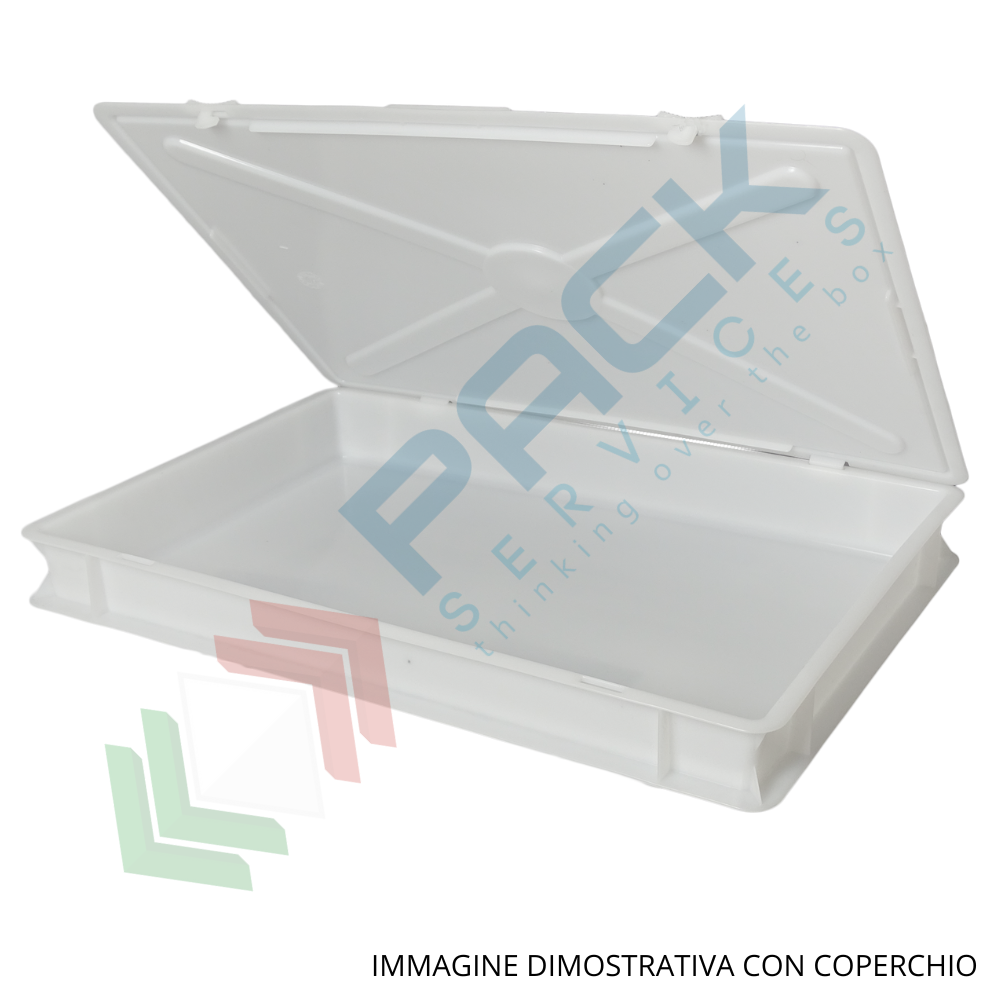 Cassetta in plastica (HDPE) sovrapponibile, capacità 18 Lt, Mis. 600 L x 400 P x 100 H mm, ideale per alimenti, fondo e pareti chiuse, colore bianco
