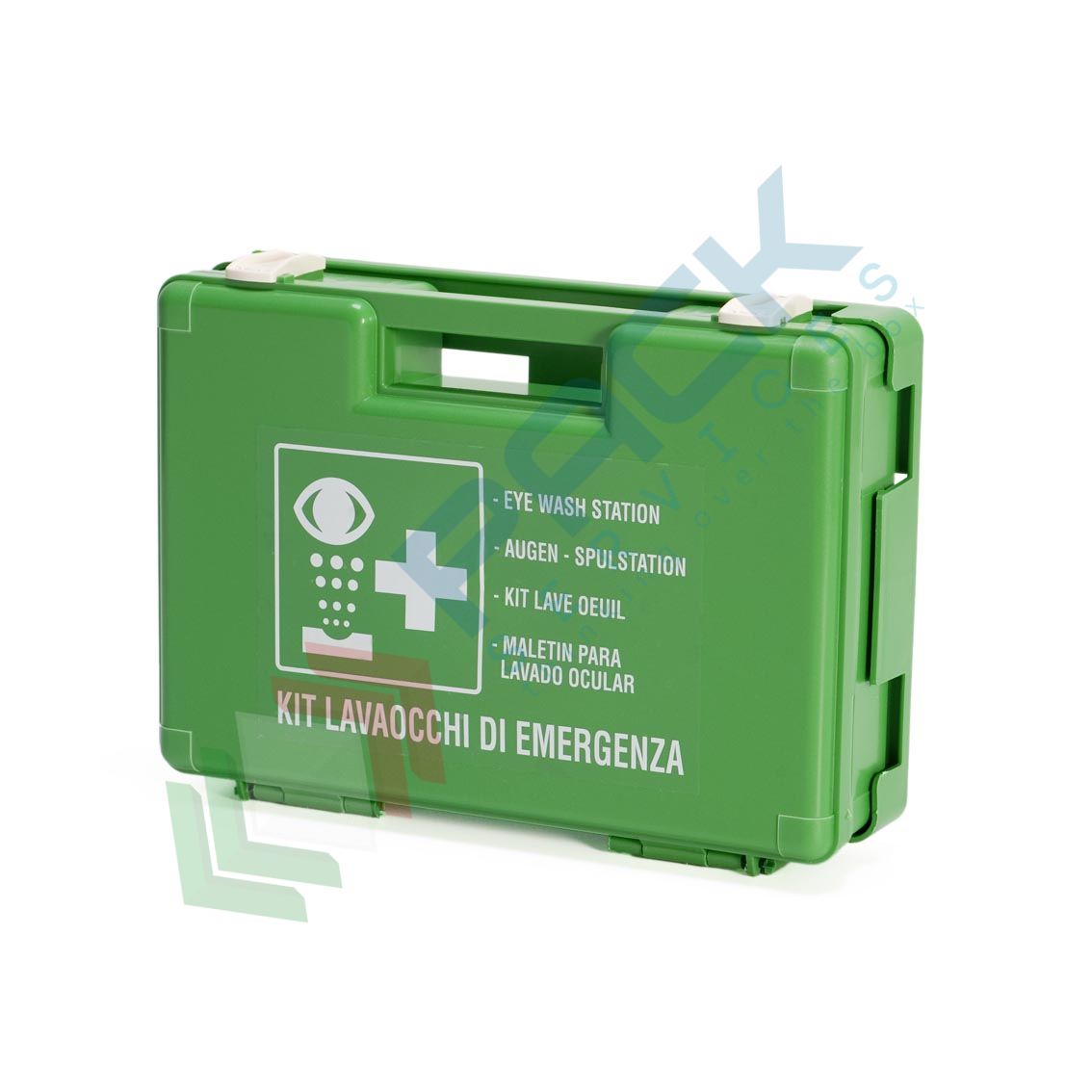 Valigetta pronto soccorso realizzata in polipropilene colore verde, supporto per attacco a parete, maniglia per trasporto, chiusura con clip rotanti. Consigliato per un primo intervento oculare demrgenza, Mis. 32 x 23 x 8 cm.