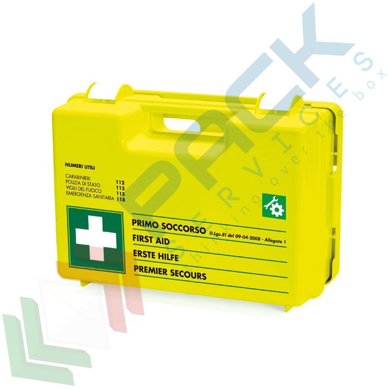Cassetta pronto soccorso colore FLUO, completa del contenuto previsto dall'allegato 1 del D.M. 388 del 15 luglio 2003 e D.L. 81 del 09 aprile 2008 art. 45, obbligatorio quindi per aziende o unità produttive del gruppo A e B con più di 3 lavoratori. Cassetta pronto soccorso Mis. 41 x 31 x 15 cm, dotata di supporto per attacco a parete, maniglia per trasporto incorporata, chiusura con due clips a scatto. Il contenuto del kit primo soccorso prevede un contenuto base, ovvero tutti i prodotti necessari in caso di emergenza come cerotti, guanti, garze, termometro, forbici e molto altro + MAGGIORAZIONE comparto OFFICINE TECNICHE. Valigetta pronto soccorso realizzata in ABS, facilmente individuabile all’interno delle attività lavorative grazie al colore giallo fluorescente e indispensabile all’esterno per le attività connesse all’edilizia e alla manutenzione stradale dove la mancanza di luce solare nelle ore pomeridiane o la presenza di nebbia e foschia potrebbero impedirne la facile individuazione.