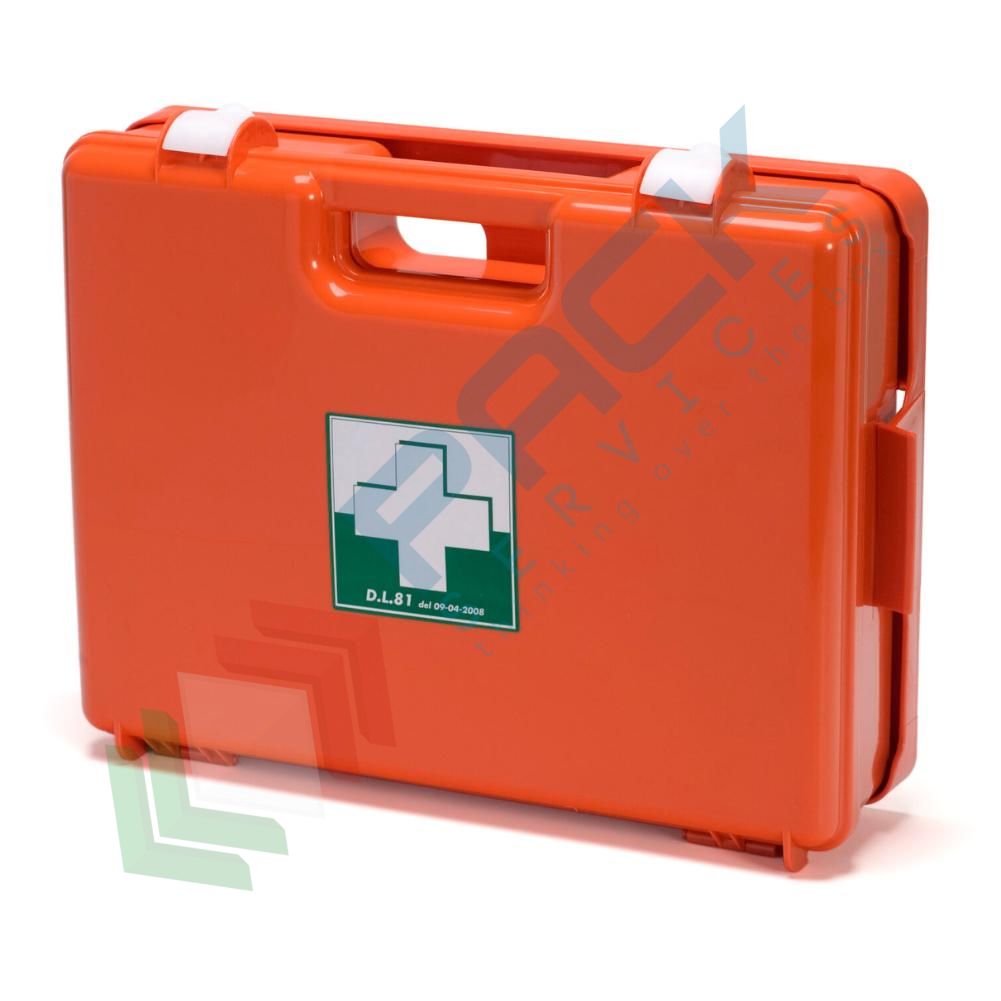 Valigetta pronto soccorso in plastica completa del contenuto previsto dall'allegato 1 del D.lgs. 81/2008-D.M.388/2003, obbligatorio quindi per aziende o unità produttive del gruppo A e B con più di 3 lavoratori. Cassetta pronto soccorso realizzata in PPL, colore arancio, con supporto a muro dotata di maniglia per il trasporto e chiusura a clip, misura 410 L x 310 P x 110 H mm. Il contenuto della cassetta primo soccorso prevede un contenuto base, ovvero tutti i prodotti necessari in caso di emergenza come cerotti, guanti, garze, termometro, forbici e molto altro. I Dispositivi contenuti nel kit sono conformi alla MDR 745/2017 del 05/04.