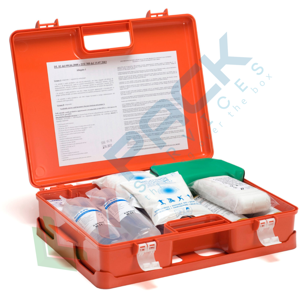 Valigetta pronto soccorso in plastica completa del contenuto previsto dall'allegato 1 del D.lgs. 81/2008-D.M.388/2003, obbligatorio quindi per aziende o unità produttive del gruppo A e B con più di 3 lavoratori. Cassetta pronto soccorso realizzata in PPL, colore arancio, con supporto a muro dotata di maniglia per il trasporto e chiusura a clip, misura 410 L x 310 P x 110 H mm. Il contenuto della cassetta primo soccorso prevede un contenuto base, ovvero tutti i prodotti necessari in caso di emergenza come cerotti, guanti, garze, termometro, forbici e molto altro. I Dispositivi contenuti nel kit sono conformi alla MDR 745/2017 del 05/04.