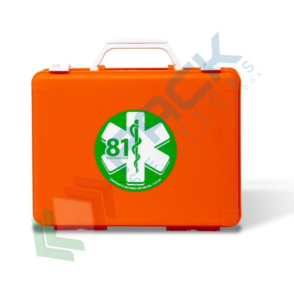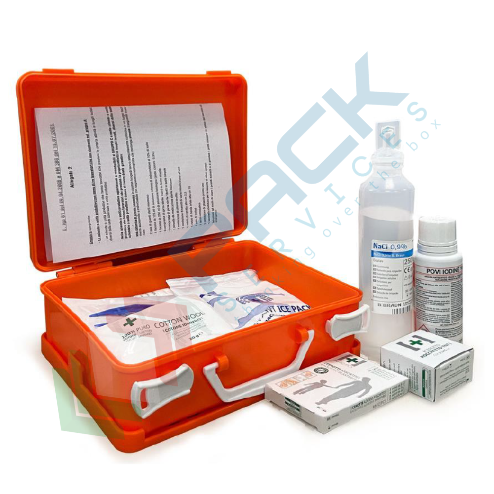 Valigetta pronto soccorso in plastica completa del contenuto previsto dall'allegato 2 del D.M. 388 del 15 luglio 2003 e D.L. 81 del 09 aprile 2008 art. 45, obbligatorio quindi per aziende o unità produttive del gruppo C con meno di tre lavoratori. L’art.2 punto 5 del DM 388 del 15.7.2003 prevede che il contenuto dell’allegato 2 deve essere fornito anche ai lavoratori che operano in luoghi diversi dalla sede aziendale o unità produttiva. Cassetta pronto soccorso realizzata in polipropilene antiurto, colore arancio, supporto per attacco a parete, maniglia per trasporto, chiusura con 2 clip rotanti, misura 250 L x 185 P x 83 H mm. Il contenuto della cassetta primo soccorso prevede un contenuto base, ovvero tutti i prodotti necessari in caso di emergenza come cerotti, guanti, garze, termometro, forbici e molto altro.