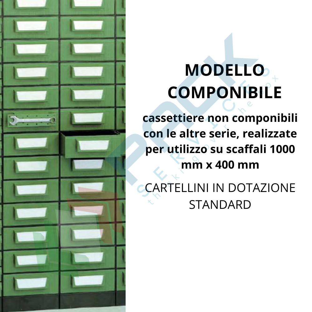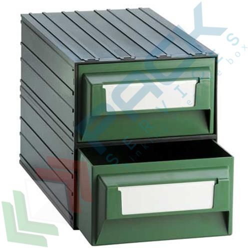 Cassettiera portaminuteria ideale per scaffali, in plastica (PST), Mis. 238 L x 423 P x 262 H mm, con 2 cassetti verdi e 3 separatori estraibili, peso 3,88 Kg. Struttura non compatibile con le altre serie, realizzata per utilizzo su scaffali 1000 mm x 400 mm. 4 cassetti affiancati consentono di utilizzare senza perdite di spazio la luce frontale nominale di 1.000 mm e la profondità di 400 mm. Cartellini e copri cartellini in dotazione standard.
