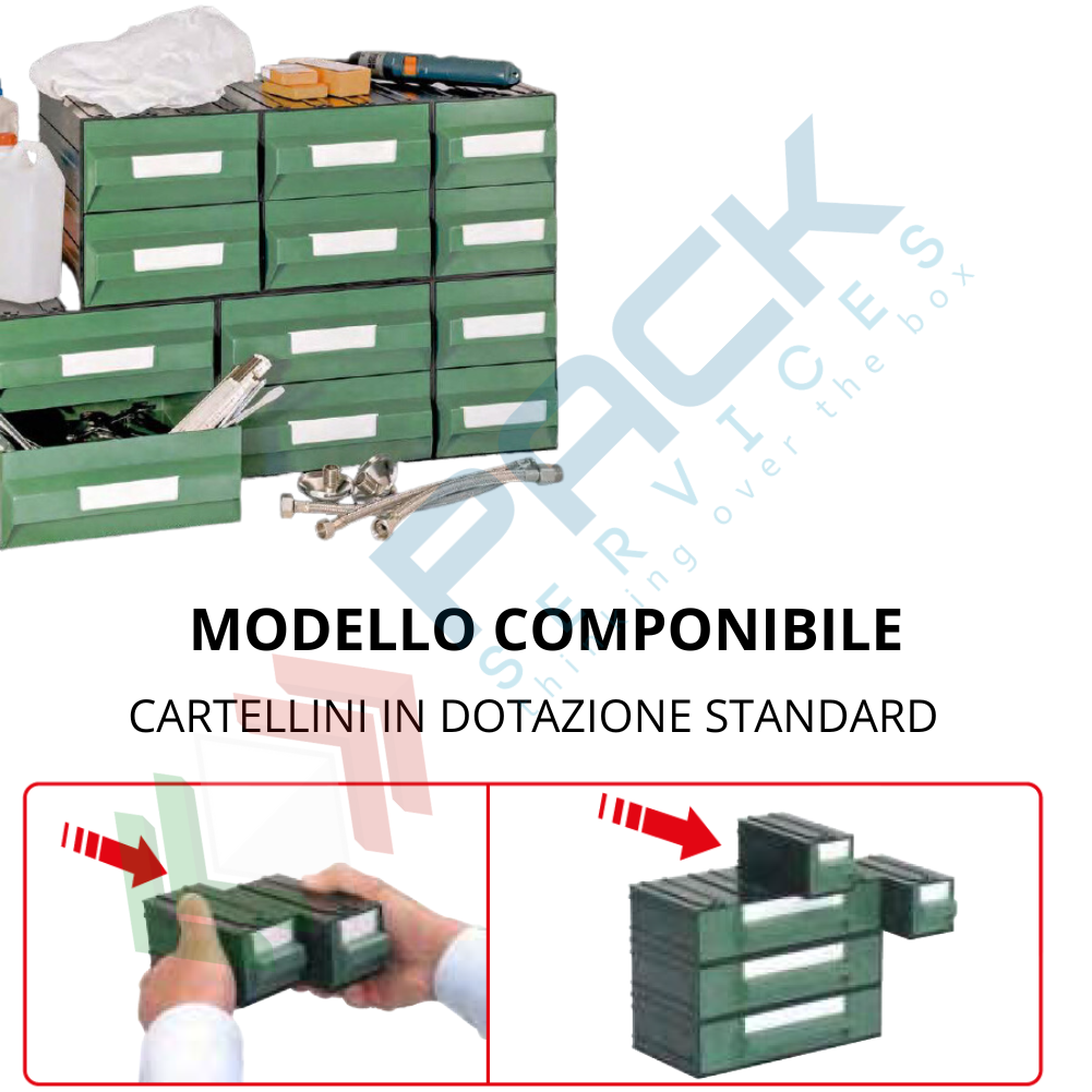 Cassettiera portaminuteria in plastica, componibile, costruita in plastica (SPT), Mis. 562 L x 390 P x 228 H mm, con 4 cassetti, peso 6 Kg. Il sistema ad incastro della cassettiera portaminuteria permette la realizzazione di vere e proprie pareti attrezzate per la classificazione, organizzazione e stoccaggio di piccoli componenti, di parti di ricambio, viteria, bulloneria, ecc.. Cassettiera portaminuteria in plastica, componibile, con cassettini in plastica trasparente che permettono di avere piccoli attrezzi e le minuterie sempre visibili, identificabili e facilmente recuperabili. Cassettiera in plastica resistente agli urti. La cassettiera MAXI si differenzia dalle altre perchè ha maggiore resistenza al carico e corpo esterno per ogni cassetto. Cartellini e copri cartellini in dotazione standard. Colore verde/nero.