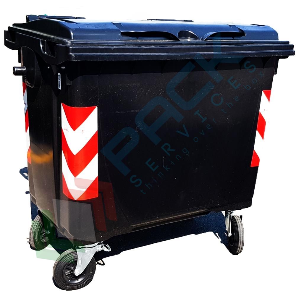 Cassonetto spazzatura in plastica ideale per la raccolta differenziata rifiuti e di materiali da recupero per il riciclo, capacità 1100 Litri, Mis. 1370 L x 1100 P x 1365 H mm, peso 56,5 Kg, capacità di carico 440 Kg. Cassonetto differenziata realizzato in polietilene alta densità (HDPE) di prima fusione garantito e certificato TUV, UNI EN 840; Materiale totalmente riciclabile, robusto e resistente ai raggi U.V. e infrarossi, agli acidi ed alcali, alle alte e basse temperature. Cassonetto immondizia con 4 ruote in gomma piena girevoli e pirottanti Ø 200 mm (ruote anteriori con frenatura indipendente a pedale). Il bidone per rifiuti dispone di coperchio piano ad apertura manuale incernierato a libro con cerniere sul bordo posteriore della vasca ed è dotato di presa per il sollevamento (ottenuta in fase di stampaggio) lungo tutto il bordo anteriore. La vasca dispone di strisce catarifrangenti Classe 1 a norma di legge (D.M. 1270/1985 e succ. modif.) con disegno "a gradi di caporale" bianco e rosso. Bidone raccolta differenziata con 4 maniglie di cui 2 a presa piena e 2 delimitate da nervature rinforzate. Cassonetto per la raccolta differenziata con attacco a pettine sul bordo anteriore della vasca e attacco maschio DIN 30700. Bidone per rifiuti colore nero.