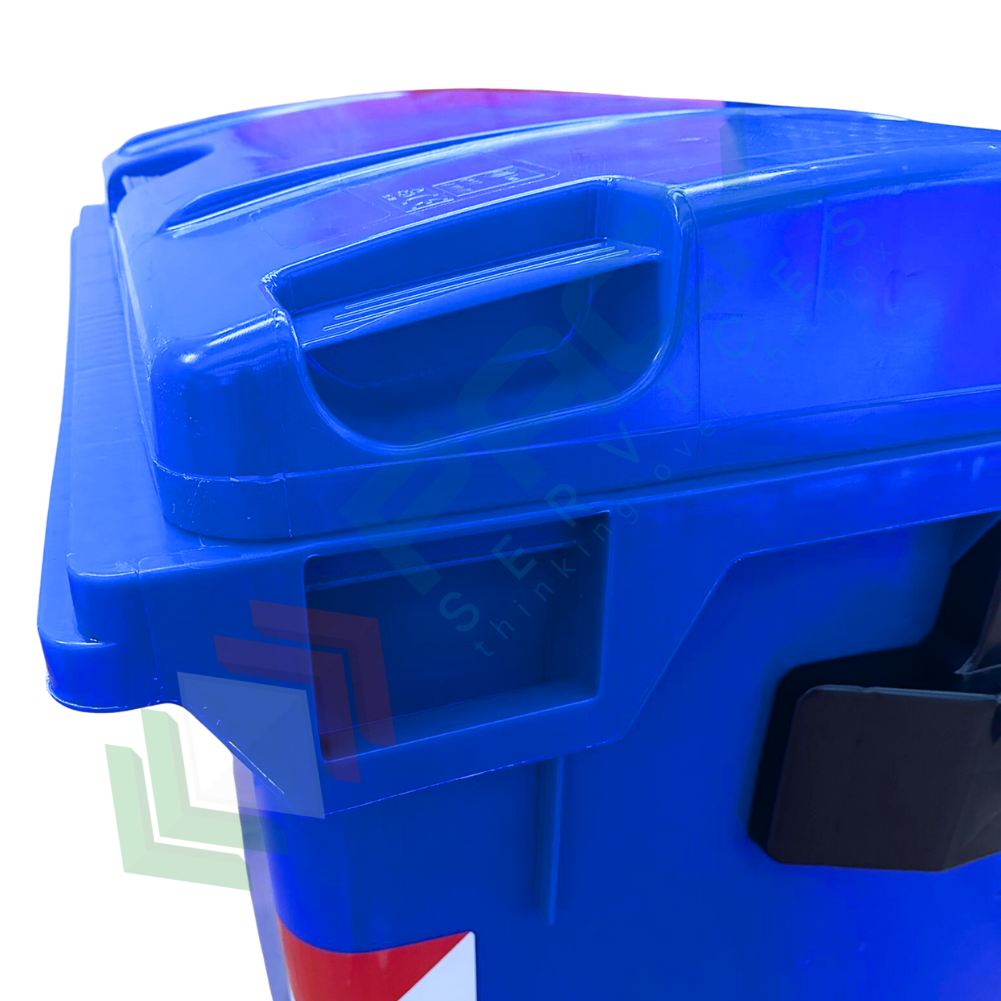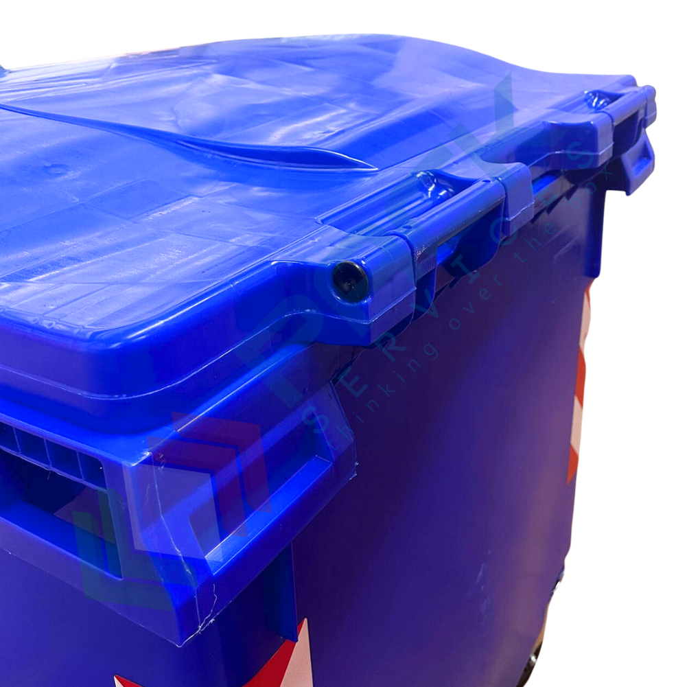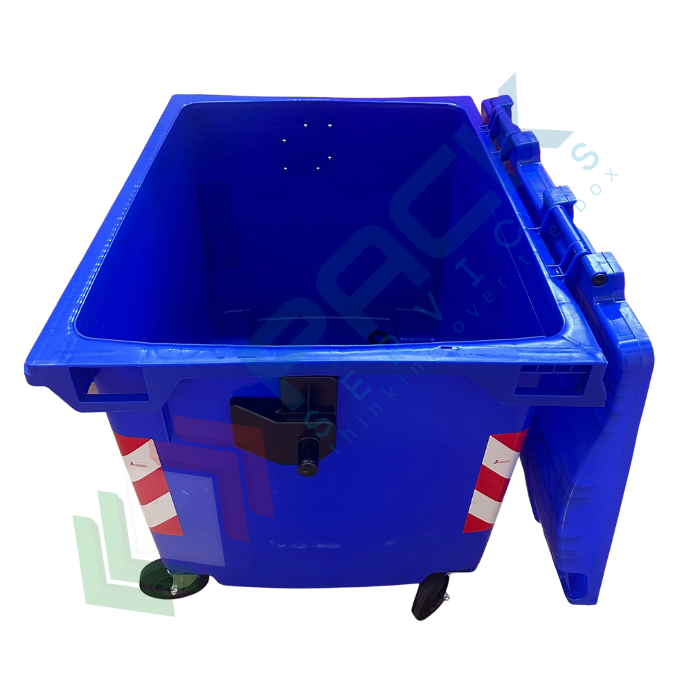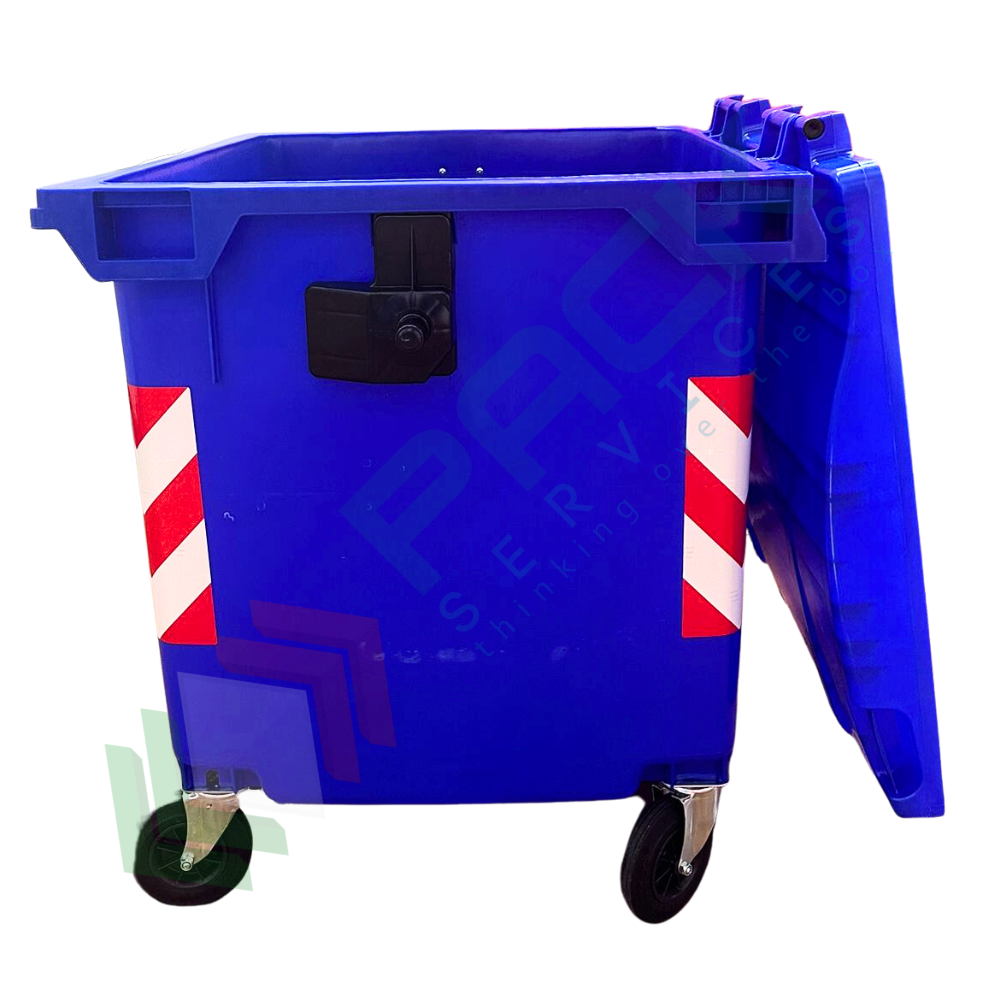 Cassonetto spazzatura in plastica ideale per la raccolta differenziata rifiuti e di materiali da recupero per il riciclo, capacità 660 Litri, Mis. 1370 L x 775 P x 1185 H mm, peso 35 Kg, capacità di carico 264 Kg, portata max 302 Kg. Cassonetto differenziata realizzato in polietilene alta densità (HDPE) di prima fusione garantito e certificato TUV, UNI EN 840; Materiale totalmente riciclabile, robusto e resistente ai raggi U.V. e infrarossi, agli acidi ed alcali, alle alte e basse temperature. Cassonetto immondizia con 4 ruote in gomma piena girevoli e pirottanti Ø 200 mm (ruote anteriori con frenatura indipendente a pedale). Il bidone per rifiuti dispone di coperchio piano ad apertura manuale incernierato a libro con cerniere sul bordo posteriore della vasca ed è dotato di presa per il sollevamento (ottenuta in fase di stampaggio) lungo tutto il bordo anteriore. La vasca dispone di strisce catarifrangenti Classe 1 a norma di legge (D.M. 1270/1985 e succ. modif.) con disegno "a gradi di caporale" bianco e rosso. Bidone raccolta differenziata con 4 maniglie di cui 2 a presa piena e 2 delimitate da nervature rinforzate. Cassonetto per la raccolta differenziata con attacco a pettine sul bordo anteriore della vasca e attacco maschio DIN 30700. Bidone per rifiuti colore blu.