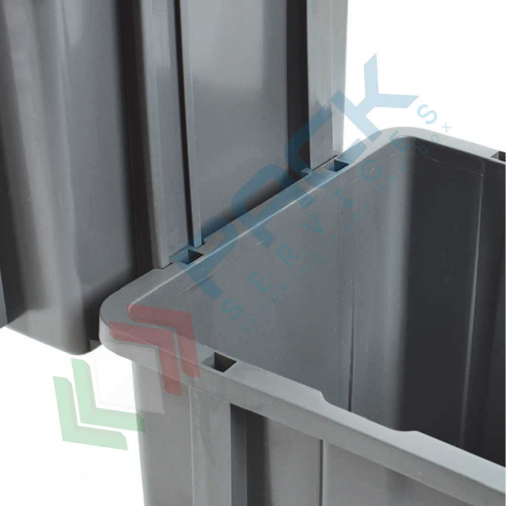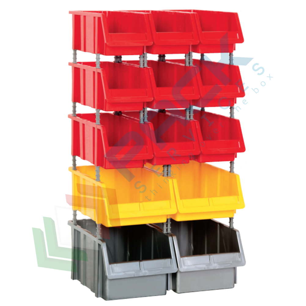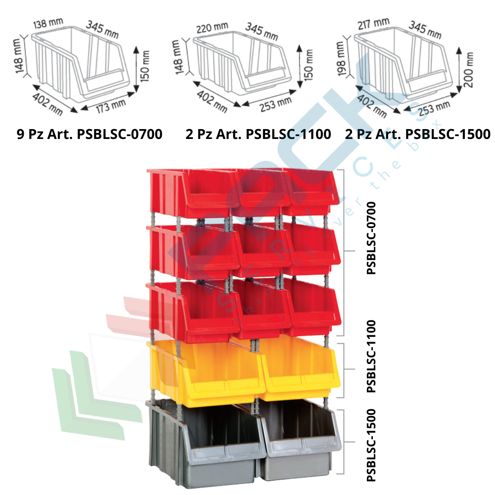 Composizione completa di 13 casse bocca di lupo, Mis. 510 L x 400 P x 1000 H mm, con appoggio a terra. Kit di contenitori bocca di lupo composto da 13 contenitori bocca di lupo così suddivisi: 9 cassette Mis. 173 L x 402 P x 150 H mm (PSBLSC-0700-ROS) + 2 cassette Mis. 253 L x 402 P x 150 H mm (PSBLSC-1100-GIA) + 2 cassette Mis. 253 L x 402 P x 200 H mm (PSBLSC-1500-GRI). Le cassette bocca di lupo sono ideali per lo stoccaggio di piccoli componenti. Le cassette bocca di lupo rappresentano la soluzione ideale per tutte le esigenze di magazzinaggio sovrapponibili, ideali per ferramenta, officine e magazzino come portaminuteria. Le comode maniglie delle cassette a bocca di lupo ne agevolano la movimentazione con un’impugnatura sicura, anche con mani guantate. I contenitori a bocca di lupo sono dotati di traversino di sollevamento che ha la funzione di facilitarne la presa ed evitare qualsiasi deformazione delle pareti laterali, in caso di grande carico. Il lato frontale aperto del contenitore portaminuteria rende facilmente accessibili i componenti al suo interno. Struttura completa di contenitori bocca di lupo, fornita smontata. Tempo di montaggio 5 minuti.