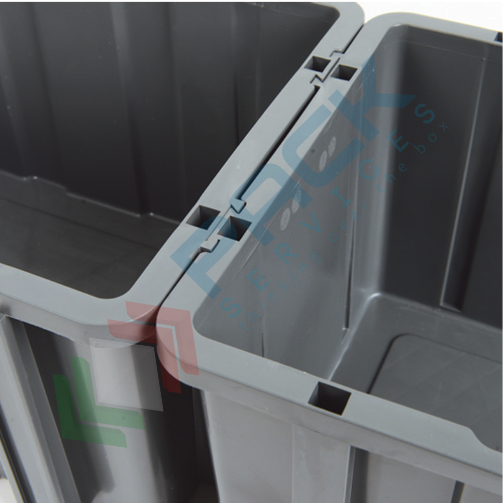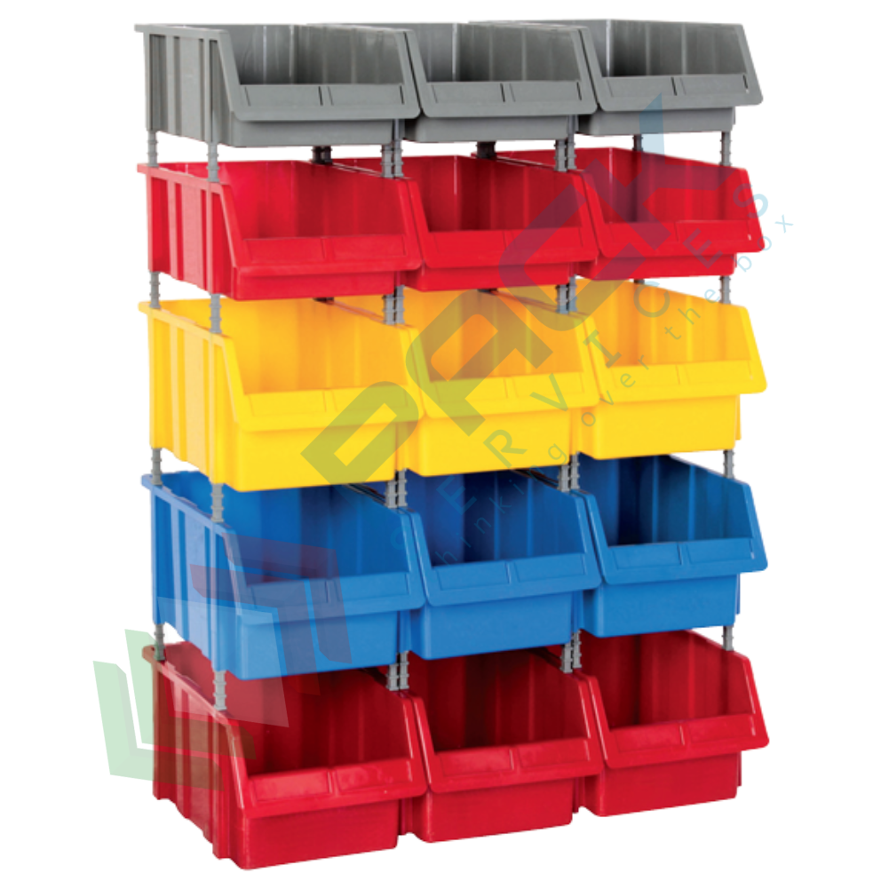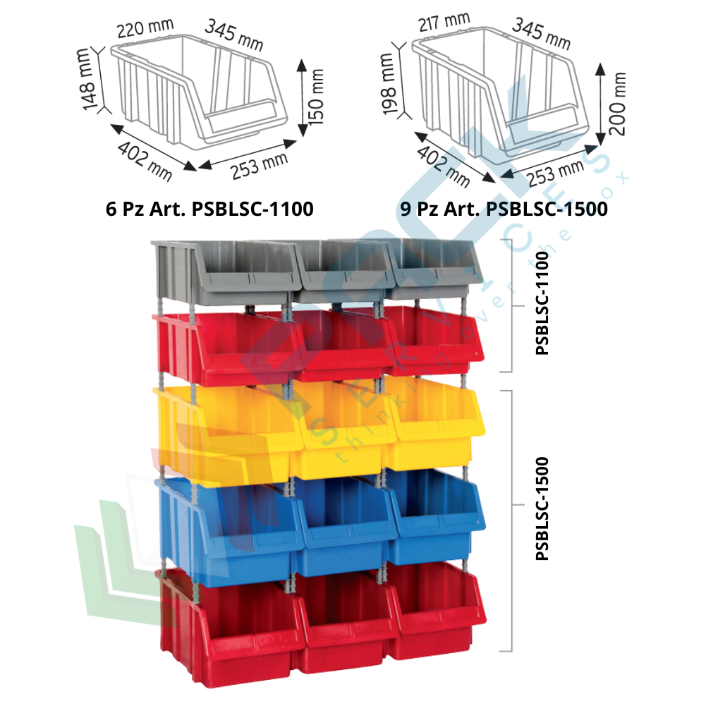 Composizione completa di 15 casse bocca di lupo, Mis. 765 L x 400 P x 1000 H mm, con appoggio a terra. Kit di contenitori bocca di lupo composto da 6 cassette Mis. 253 L x 402 P x 150 H mm (3 cassette PSBLSC-1100-GRI + 3 cassette PSBLSC-1100-ROS) + 9 cassette Mis. 253 L x 402 P x 200 H mm (3 cassette PSBLSC-1500-GIA + 3 cassette PSBLSC-1500-BLU + 3 cassette PSBLSC-1500-ROS). Le cassette bocca di lupo sono ideali per lo stoccaggio di piccoli componenti. Le cassette bocca di lupo rappresentano la soluzione ideale per tutte le esigenze di magazzinaggio sovrapponibili, ideali per ferramenta, officine e magazzino come portaminuteria. Le comode maniglie delle cassette a bocca di lupo ne agevolano la movimentazione con un’impugnatura sicura, anche con mani guantate. I contenitori a bocca di lupo sono dotati di traversino di sollevamento che ha la funzione di facilitarne la presa ed evitare qualsiasi deformazione delle pareti laterali, in caso di grande carico. Il lato frontale aperto del contenitore portaminuteria rende facilmente accessibili i componenti al suo interno. Struttura completa di contenitori bocca di lupo, fornita smontata. Tempo di montaggio 5 minuti.