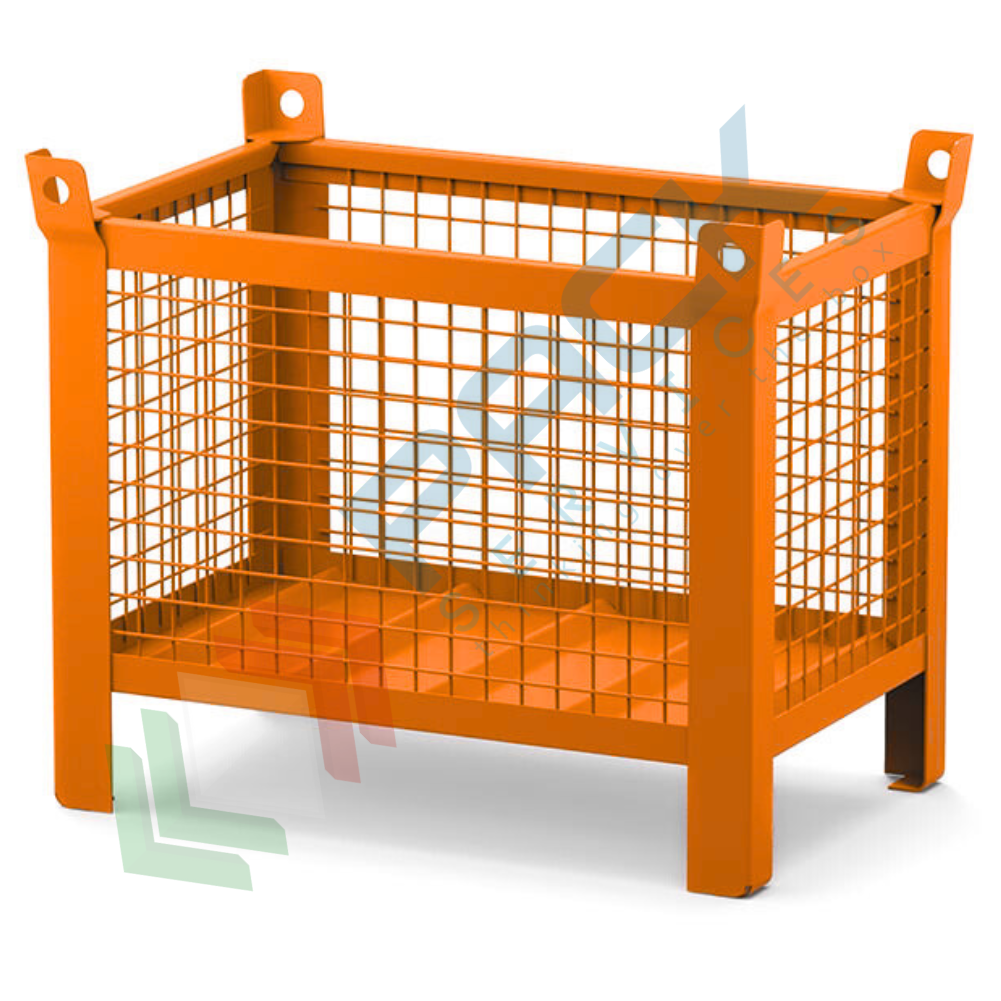 Cassone in ferro con pareti in rete, 4 piedi, Mis. 800 L x 500 P x 695 H mm, portata 500 Kg per lo stoccaggio e trasporto di componenti industriali, con piedini che permettono la movimentazione con transpallet o carrelli elevatori. I contenitori in lamiera hanno la possibilità di sovrapporre più elementi per aumentare le possibilità di sfruttamento dello spazio verticale presente in magazzino e permettere un ordinato e sicuro stoccaggio dei materiali, riducendo la possibilità di infortuni derivanti da materiali sparsi. I nostri contenitori metallici garantiscono la massima facilità di utilizzo ed aumentano la produttività all'interno dell'impresa. Cassoni in metallo 4 piedi con pareti e fondo realizzati con una lamiera particolarmente pesante che assicura una perfetta funzionalità e resa del contenitore stesso anche nelle condizioni di utilizzo più critiche. Sovrapponibilità 1+3 esclusivamente su superfici piane e di adeguata consistenza, con carico a diminuire dal basso verso l'alto. Carico massimo consentito del singolo contenitore 500 Kg uniformemente distribuito. Essendo forati, i contenitori industriali in rete consentono di poter vedere quale tipo di materiale contengono, evitando così di dover movimentare altri contenitori oppure trasportarne uno sbagliato. Colore arancione RAL 2004.