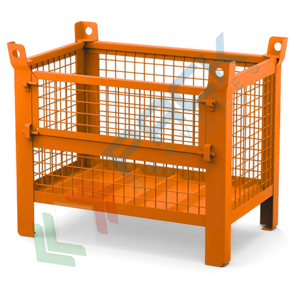 Cassone in ferro con pareti in rete, 4 piedi, Mis. 800 L x 600 P x 695 H mm, portata 500 Kg per lo stoccaggio e trasporto di componenti industriali, con piedini che permettono la movimentazione con transpallet o carrelli elevatori. Il contenitore metallico presenta una porta in rete di lamiera che facilita le operazioni di carico e scarico del materiale e la visibilità del materiale contenuto. I contenitori in lamiera hanno la possibilità di sovrapporre più elementi per aumentare le possibilità di sfruttamento dello spazio verticale presente in magazzino e permettere un ordinato e sicuro stoccaggio dei materiali, riducendo la possibilità di infortuni derivanti da materiali sparsi. I nostri contenitori metallici garantiscono la massima facilità di utilizzo ed aumentano la produttività all'interno dell'impresa. Cassoni in metallo 4 piedi con pareti e fondo realizzati con una lamiera particolarmente pesante che assicura una perfetta funzionalità e resa del contenitore stesso anche nelle condizioni di utilizzo più critiche. Sovrapponibilità 1+3 esclusivamente su superfici piane e di adeguata consistenza, con carico a diminuire dal basso verso l'alto. Carico massimo consentito del singolo contenitore 500 Kg uniformemente distribuito. Essendo forati, i contenitori industriali in rete consentono di poter vedere quale tipo di materiale contengono, evitando così di dover movimentare altri contenitori oppure trasportarne uno sbagliato. Colore arancione RAL 2004.
