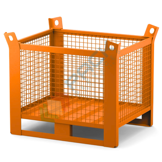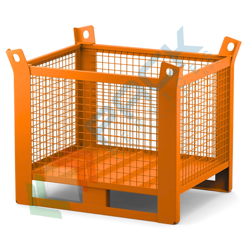Contenitore in rete di lamiera con slitte lato lungo, Mis. 1200 L x 800 P x 900 H mm, portata 1500 Kg, colore arancio RAL 2004