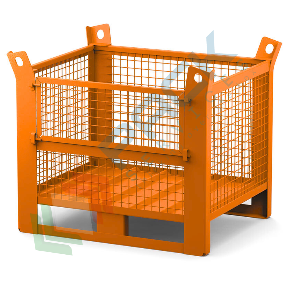 Contenitore in rete di lamiera con slitte lato lungo e anta, Mis. 1200 L x 1000 P x 900 H mm, portata 1500 Kg, colore arancio RAL 2004