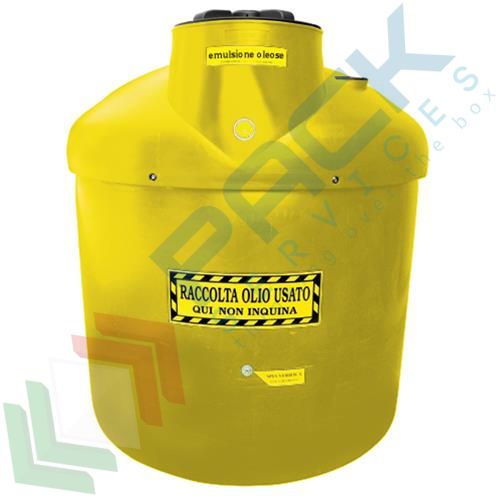 Contenitore per la raccolta di emulsioni oleose usate, cilindrico verticale con struttura auto-portante, fondo piano e parte superiore bombata, capacità 1200 Litri, Mis. Ø 1400 x 1485 H mm. Serbatoio per olio esausto realizzato in polietilene atossico stabilizzato U.V. per una maggiore protezione dagli agenti atmosferici, mediante la tecnica dello stampaggio rotazionale. Composto da una vasca interna a contatto con le emulsioni oleose e di una esterna che svolge la funzione di vasca di sicurezza e di contenimento. É dotato, nella parte superiore, di un ampio boccaporto con coperchio rettangolare ribaltabile all'interno è alloggiato un cestello filtro di forma rettangolare asportabile ed un vano per l'immissione e l'estrazione delle emulsioni oleose. Inoltre è equipaggiato di un indicatore visivo di livello per controllare la quantità di emulsioni oleose contenuta ed infine una spia di verifica per il monitoraggio dell'intercapedine della vasca di contenimento. Contenitore per lo stoccaggio di olio usato che può essere appoggiato direttamente su superfici piane senza accorgimenti particolari. Contenitore coperto da brevetto. Impiegato tipicamente per lo stoccaggio di emulsioni oleose usate.