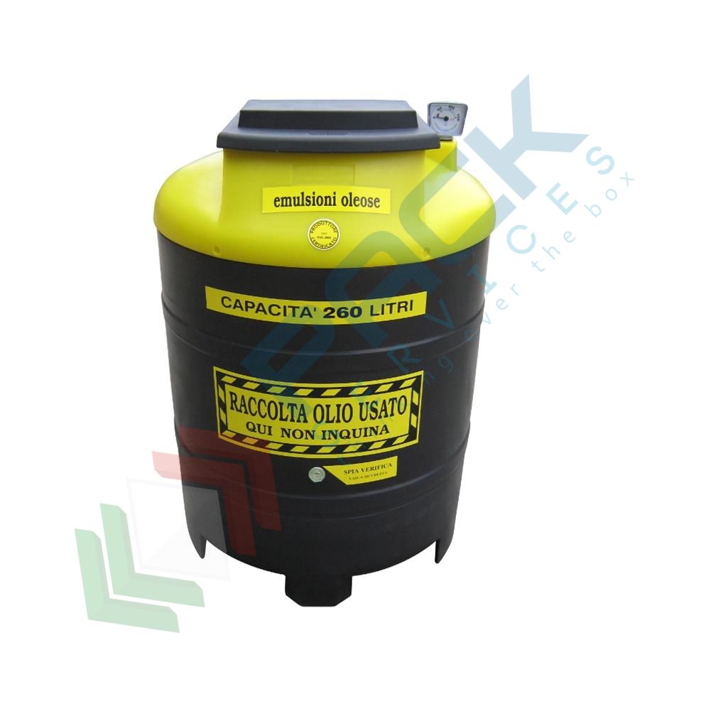 Contenitore per la raccolta di emulsioni oleose usate, cilindrico verticale con struttura auto-portante, fondo piano e parte superiore bombata, capacità 260 Litri, Mis. Ø 800 x 1160 H mm. Serbatoio per olio esausto realizzato in polietilene atossico stabilizzato U.V. per una maggiore protezione dagli agenti atmosferici, mediante la tecnica dello stampaggio rotazionale. Composto da una vasca interna a contatto con le emulsioni oleose e di una esterna che svolge la funzione di vasca di sicurezza e di contenimento. É dotato, nella parte superiore, di un ampio boccaporto con coperchio rettangolare ribaltabile all'interno è alloggiato un cestello filtro di forma rettangolare asportabile ed un vano per l'immissione e l'estrazione delle emulsioni oleose. Inoltre è equipaggiato di un indicatore visivo di livello per controllare la quantità di emulsioni oleose contenuta ed infine una spia di verifica per il monitoraggio dell'intercapedine della vasca di contenimento. Contenitore per lo stoccaggio di olio usato che può essere appoggiato direttamente su superfici piane senza accorgimenti particolari. Contenitore coperto da brevetto. Impiegato tipicamente per lo stoccaggio di emulsioni oleose usate.
