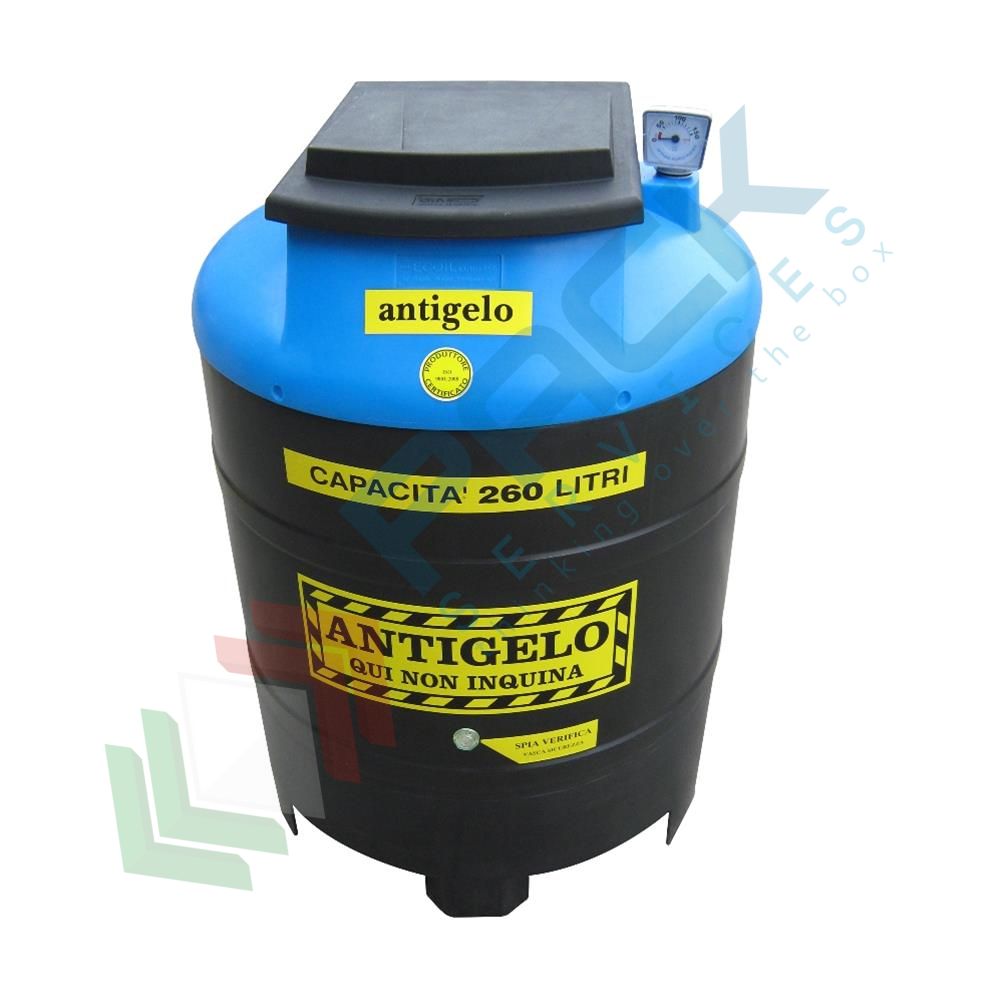 Contenitore per la raccolta di liquido antigelo usato, cilindrico verticale con struttura auto-portante, fondo piano e parte superiore bombata, capacità 260 Lt, Mis. Ø 800 x 1160 H mm. Serbatoio realizzato in polietilene atossico stabilizzato U.V. per una maggiore protezione dagli agenti atmosferici, mediante la tecnica dello stampaggio rotazionale. Il contenitore per olio esausto è composto da una vasca interna a contatto con il liquido antigelo e di una esterna che svolge la funzione di vasca di sicurezza e di contenimento. É dotato, nella parte superiore, di un ampio boccaporto con coperchio rettangolare ribaltabile all'interno è alloggiato un cestello filtro di forma rettangolare asportabile ed un vano per l'immissione e l'estrazione del liquido antigelo. Inoltre è equipaggiato di un indicatore visivo di livello per controllare la quantità di liquido antigelo contenuto ed infine una spia di verifica per il monitoraggio dell'intercapedine della vasca di contenimento. Può essere appoggiato direttamente su superfici piane senza accorgimenti particolari. Contenitore coperto da brevetto. Impiegato tipicamente per lo stoccaggio di liquido antigelo usato.