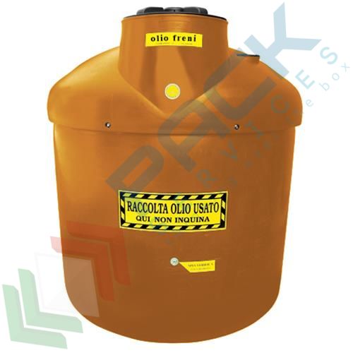 Contenitore per la raccolta di olio freni usato, cilindrico verticale con struttura auto-portante, fondo piano e parte superiore bombata, capacità 1200 Lt, Mis. Ø 1400 x 1485 H mm. Serbatoio per olio esausto realizzato in polietilene atossico stabilizzato U.V. per una maggiore protezione dagli agenti atmosferici, mediante la tecnica dello stampaggio rotazionale. Composto da una vasca interna a contatto con l'olio e di una esterna che svolge la funzione di vasca di sicurezza e di contenimento. É dotato, nella parte superiore, di un ampio boccaporto con coperchio ermetico ribaltabile all'interno è alloggiato un cestello scolabottiglie asportabile, un secondo boccaporto con coperchio filettato posizionato lateralmente per l'immissione e l'estrazione dell'olio freni esausto. Inoltre è equipaggiato di un indicatore visivo di livello per controllare la quantità di olio freni usato contenuto ed infine una spia di verifica per il monitoraggio dell'intercapedine della vasca di contenimento. Contenitore per lo stoccaggio di olio usato che può essere appoggiato direttamente su superfici piane senza accorgimenti particolari. Contenitore coperto da brevetto. Impiegato tipicamente per lo stoccaggio di olio freni usato.