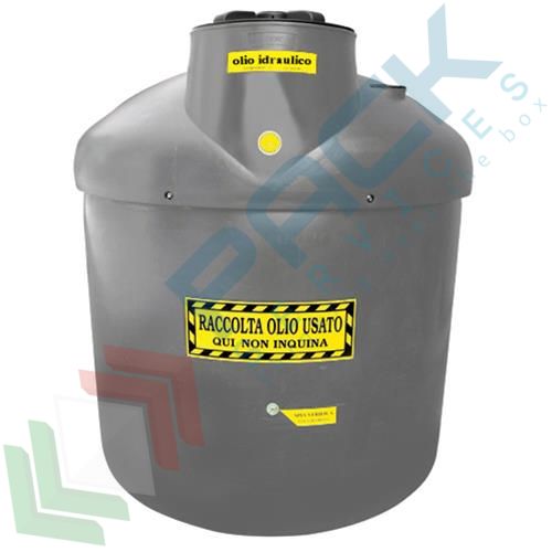 Contenitore per la raccolta di olio idraulico usato, cilindrico verticale con struttura auto-portante, fondo piano e parte superiore bombata, capacità 1200 Lt, Mis. Ø 1400 x 1485 H mm. Serbatoio per olio esausto realizzato in polietilene atossico stabilizzato U.V. per una maggiore protezione dagli agenti atmosferici, mediante la tecnica dello stampaggio rotazionale. Composto da una vasca interna a contatto con l'olio e di una esterna che svolge la funzione di vasca di sicurezza e di contenimento. É dotato, nella parte superiore, di un ampio boccaporto con coperchio ermetico ribaltabile all'interno è alloggiato un cestello scolabottiglie asportabile, un secondo boccaporto con coperchio filettato posizionato lateralmente per l'immissione e l'estrazione dell'olio idraulico esausto. Inoltre è equipaggiato di un indicatore visivo di livello per controllare la quantità di olio idraulico usato contenuto ed infine una spia di verifica per il monitoraggio dell'intercapedine della vasca di contenimento. Contenitore per lo stoccaggio di olio usato che può essere appoggiato direttamente su superfici piane senza accorgimenti particolari. Contenitore coperto da brevetto. Impiegato tipicamente per lo stoccaggio di olio idraulico usato.