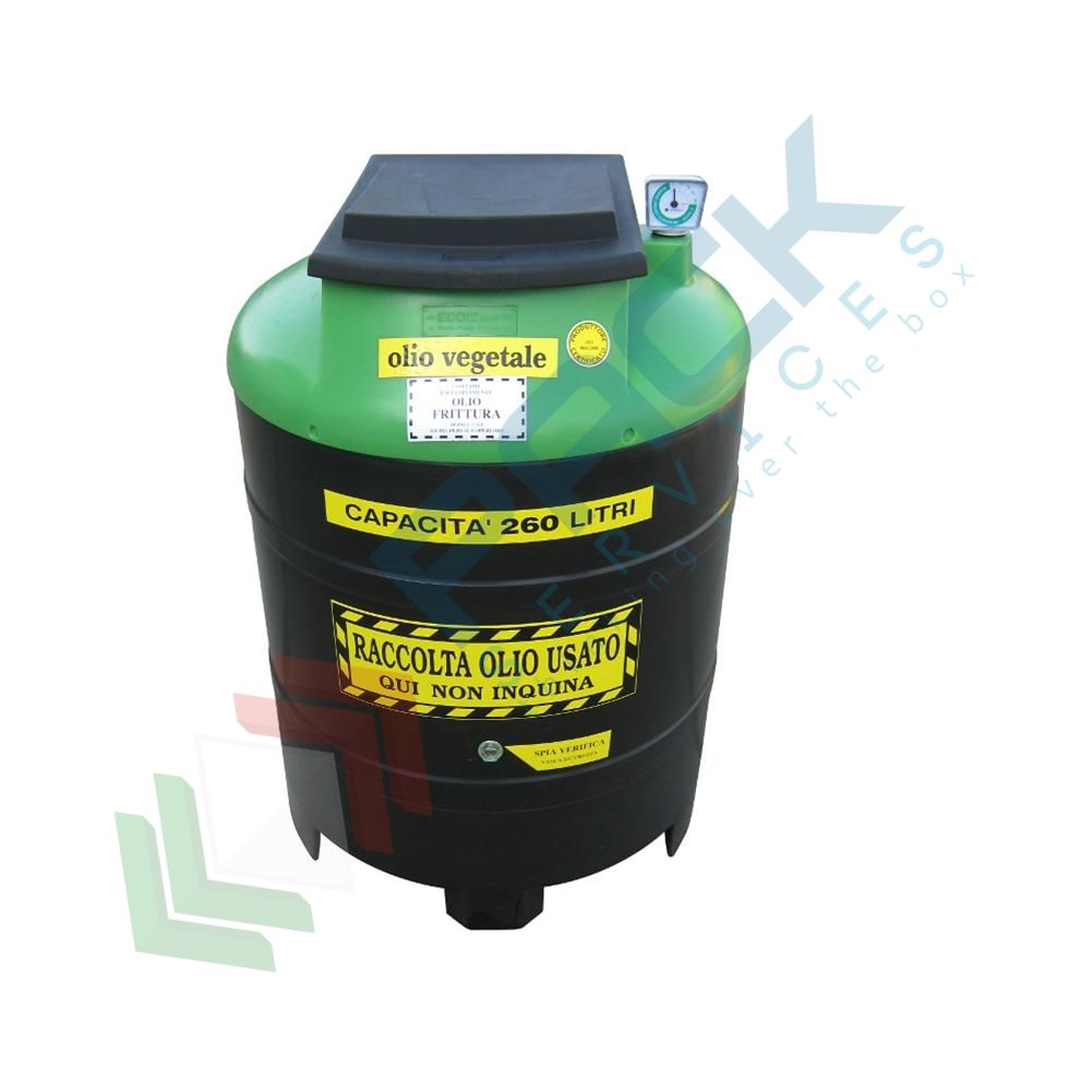 Contenitore per la raccolta di oli vegetali usati, cilindrico verticale con struttura auto-portante, fondo piano e parte superiore bombata, capacità 260 Lt, mis. Ø 800 x 1160 H mm. Serbatoio per lo stoccaggio di olio esausto realizzato in polietilene atossico stabilizzato U.V. per una maggiore protezione dagli agenti atmosferici, mediante la tecnica dello stampaggio rotazionale. Composto da una vasca interna a contatto con l'olio e di una esterna che svolge la funzione di vasca di sicurezza e di contenimento. É dotato, nella parte superiore, di un ampio boccaporto con coperchio rettangolare ribaltabile all'interno è alloggiato un cestello scolabottiglie di forma rettangolare asportabile ed un vano per l'immissione e l'estrazione dell'olio vegetale esausto. Inoltre è equipaggiato di un indicatore visivo di livello per il controllo della quantità di olio vegetale usato contenuta ed infine una spia di verifica per il monitoraggio dell'intercapedine della vasca di contenimento. Contenitore per lo stoccaggio di olio esausto che può essere appoggiato direttamente su superfici piane senza accorgimenti particolari. Contenitore coperto da brevetto. Impiegato tipicamente per lo stoccaggio di olio vegetale usato.