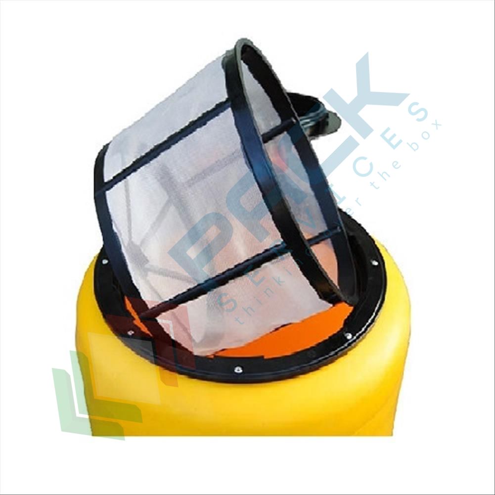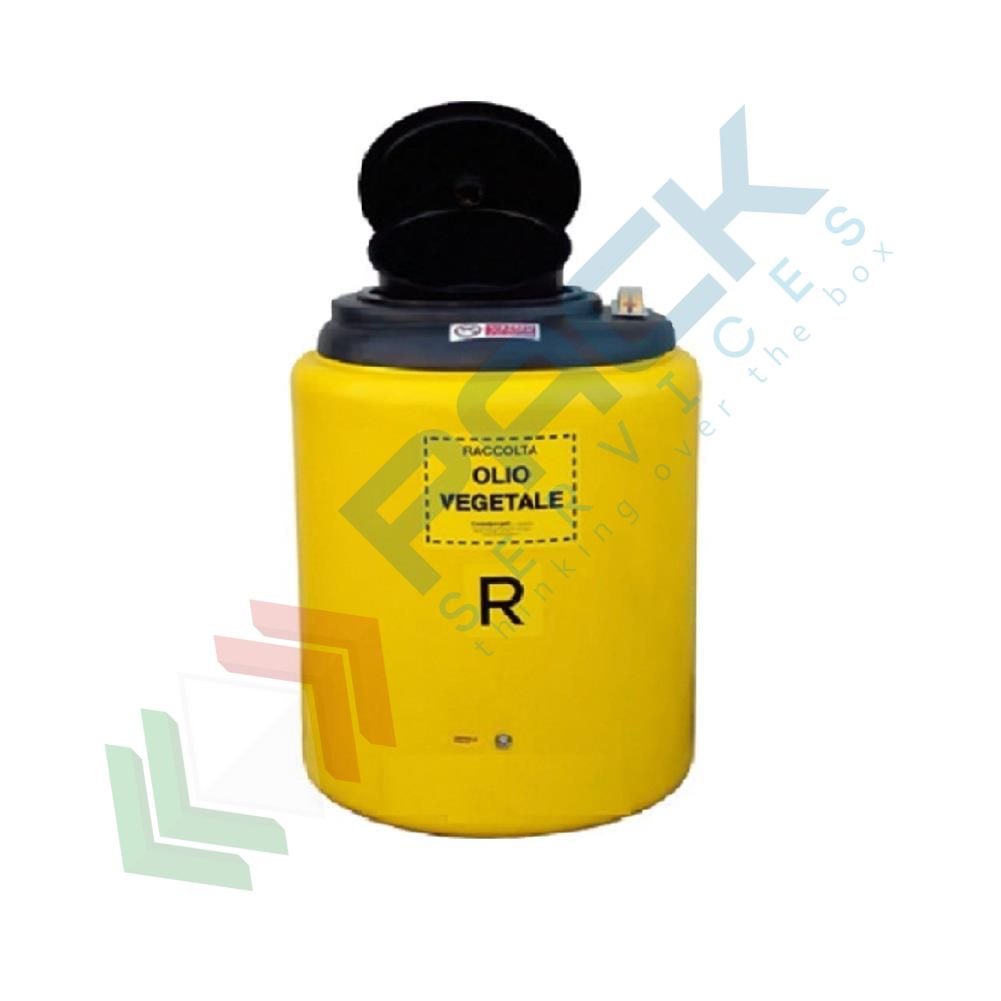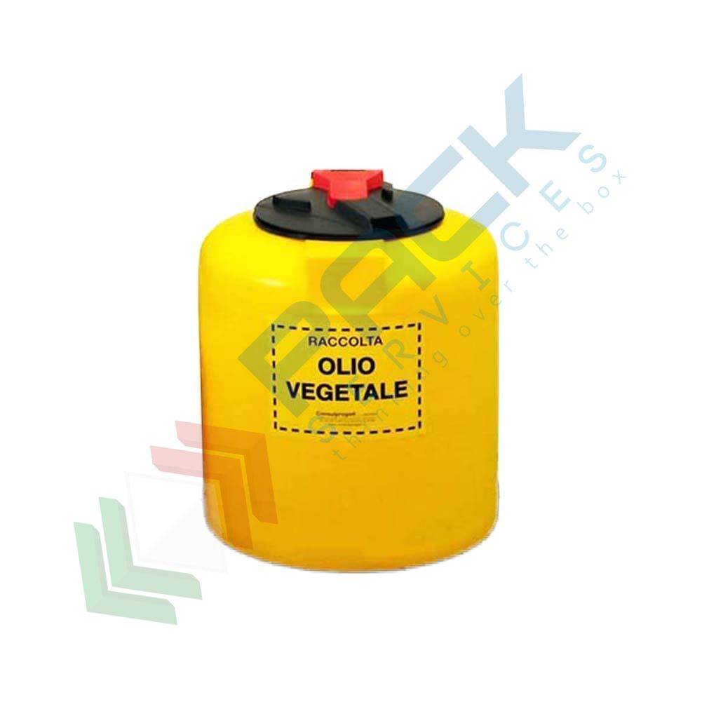Serbatoio di contenimento per olio vegetale usato, monoparete per esterno ed interno capacità 50 Lt, Mis. Ø 430 x 460 H mm. Contenitore raccolta olio vegetale a forma cilindrica verticale, fondo piano, realizzato con stampaggio rotazionale centrifugo senza saldatura e giunzione. Contenitore di raccolta in polietilene (PE) antiurto antiacido, trattato anti-UV per esposizione permanente agli agenti atmosferici esterni. Serbatoio di contenimento monoparete a camera chiusa. Boccaporto superiore per immissione olio con coperchio incernierato, chiusura a baionetta, sfiato incorporato. Cestello filtrante gran volume estraibile per scolamento bottiglie e taniche. Simbologia obbligatoria di sicurezza. Scritta adesiva frontale di identificazione del rifiuto. Colore giallo.