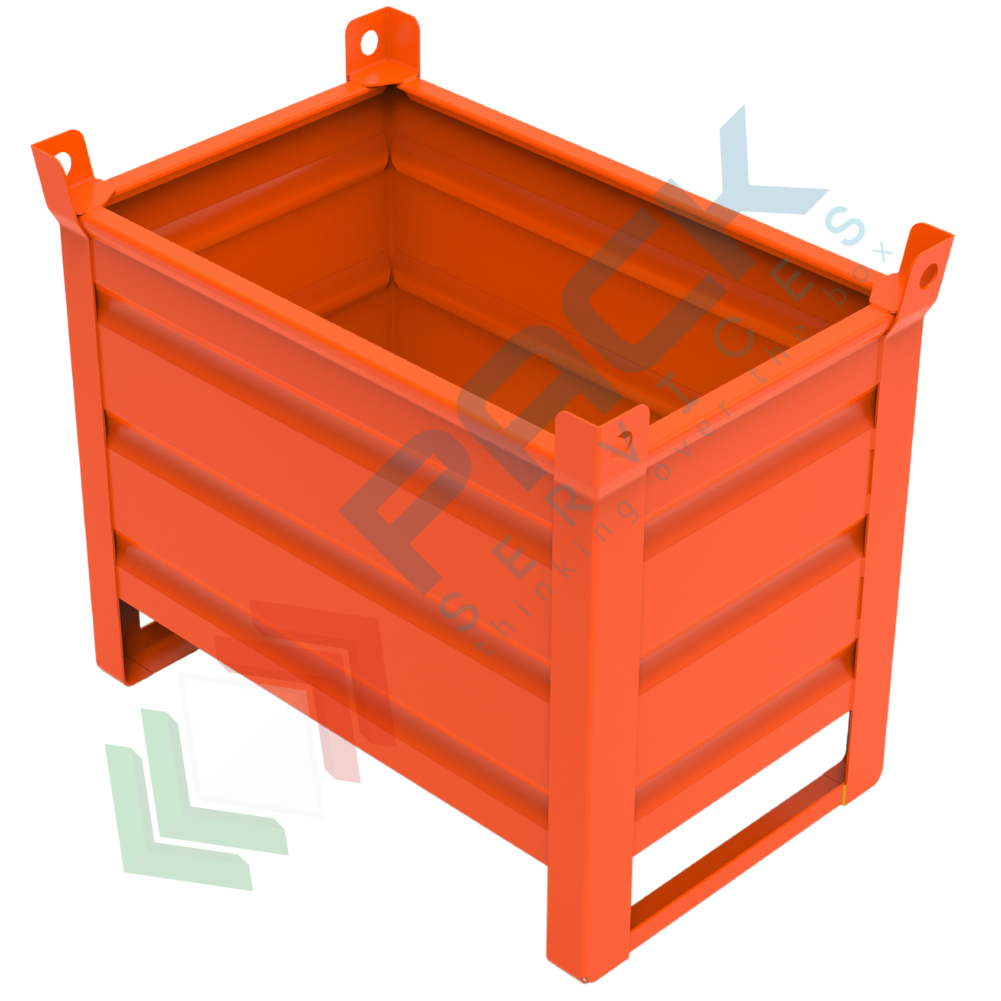 Contenitore in lamiera con slitte lato corto, Mis. 800 L x 500 P x 695 H mm, portata 600 Kg, colore arancio RAL 2004