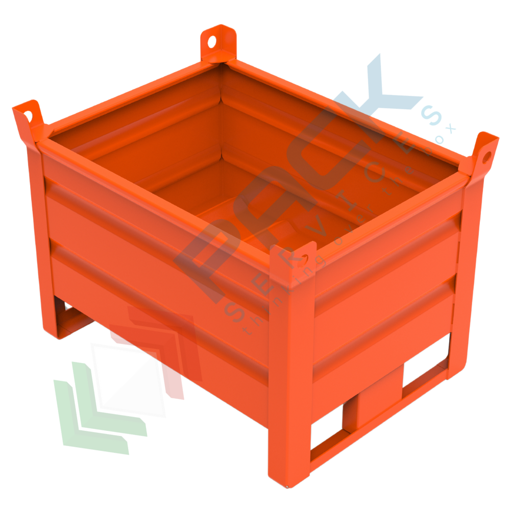 Contenitore in lamiera con slitte lato corto, Mis. 800 L x 600 P x 595 H mm, portata 800 Kg, colore arancio RAL 2004