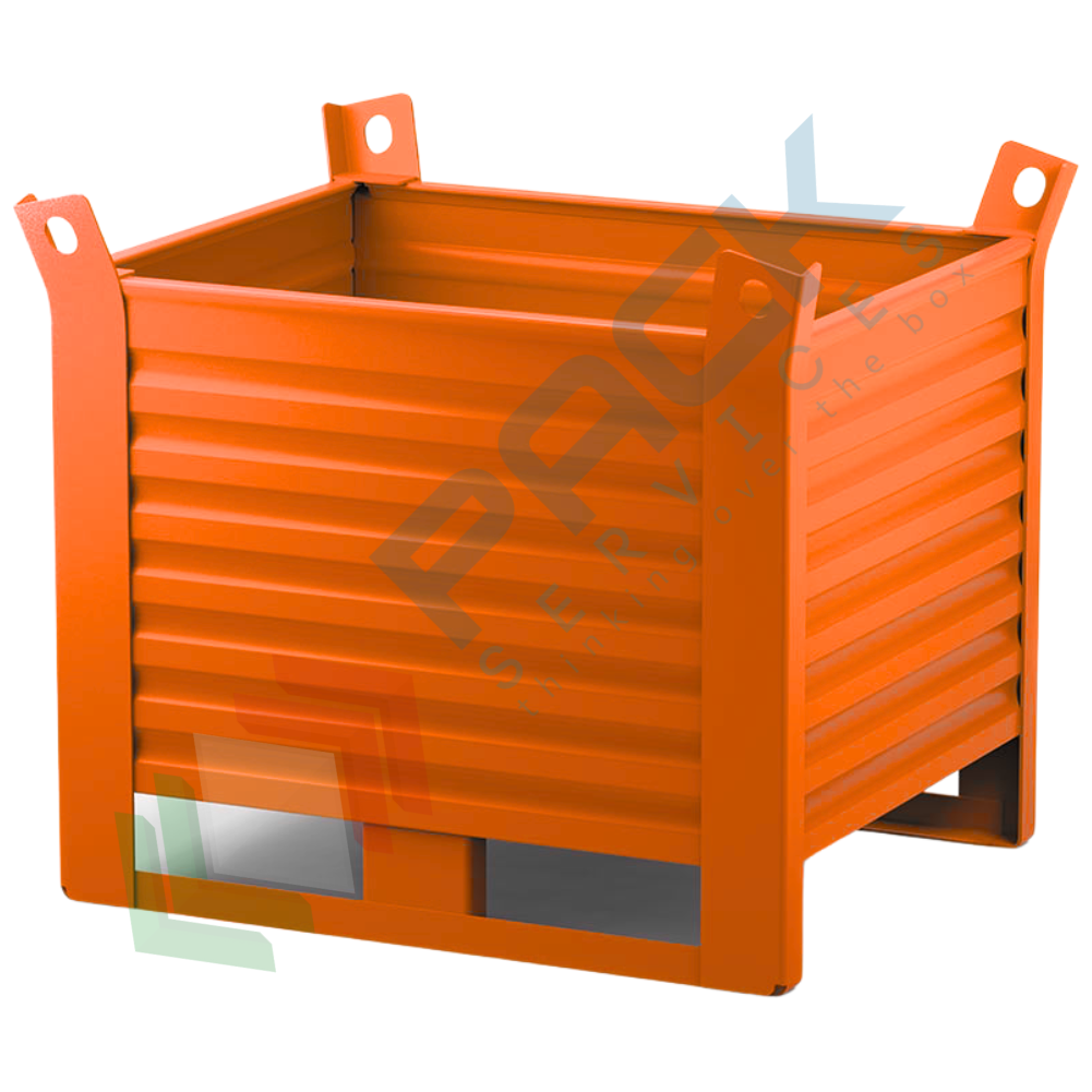 Contenitore in lamiera con slitte lato lungo, Mis. 1200 L x 800 P x 900 H mm, portata 1500 Kg, colore arancio RAL 2004