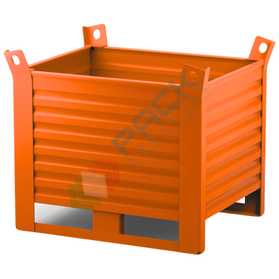 Contenitore in lamiera con slitte lato lungo, Mis. 1200 L x 800 P x 900 H mm, portata 2000 Kg, colore arancio RAL 2004