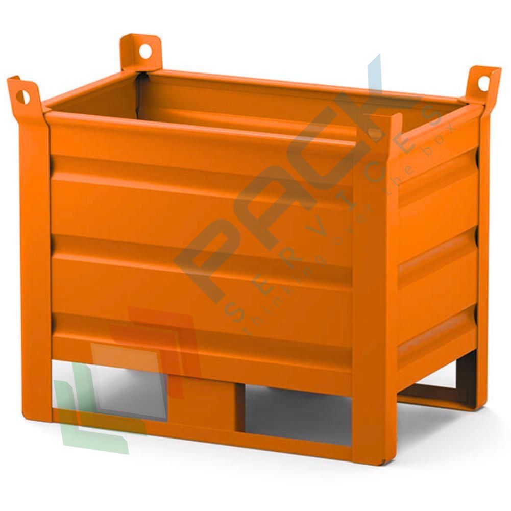 Contenitore in lamiera con slitte lato lungo, Mis. 800 L x 600 P x 595 H mm, portata 800 Kg, colore arancio RAL 2004