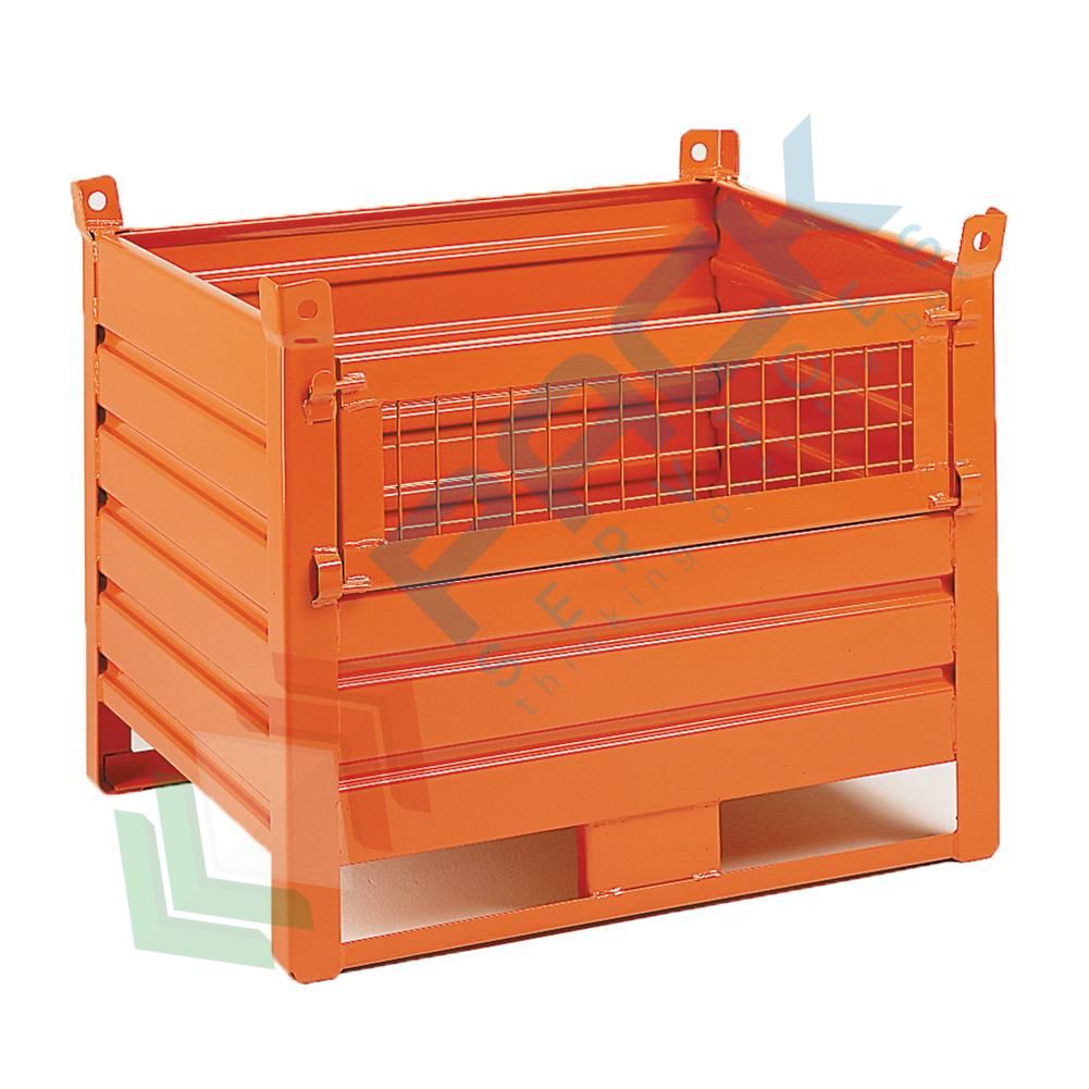 Contenitore in lamiera con slitte lato lungo e anta in rete, Mis. 1000 L x 800 P x 695 H mm, portata 1000 Kg, colore arancio RAL 2004