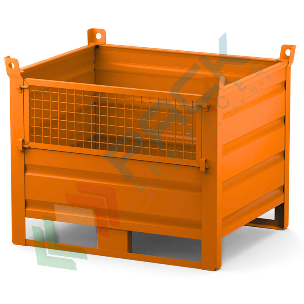 Contenitore in lamiera con slitte lato lungo e anta in rete, Mis. 1200 L x 800 P x 845 H mm, portata 1000 Kg, colore arancio RAL 2004